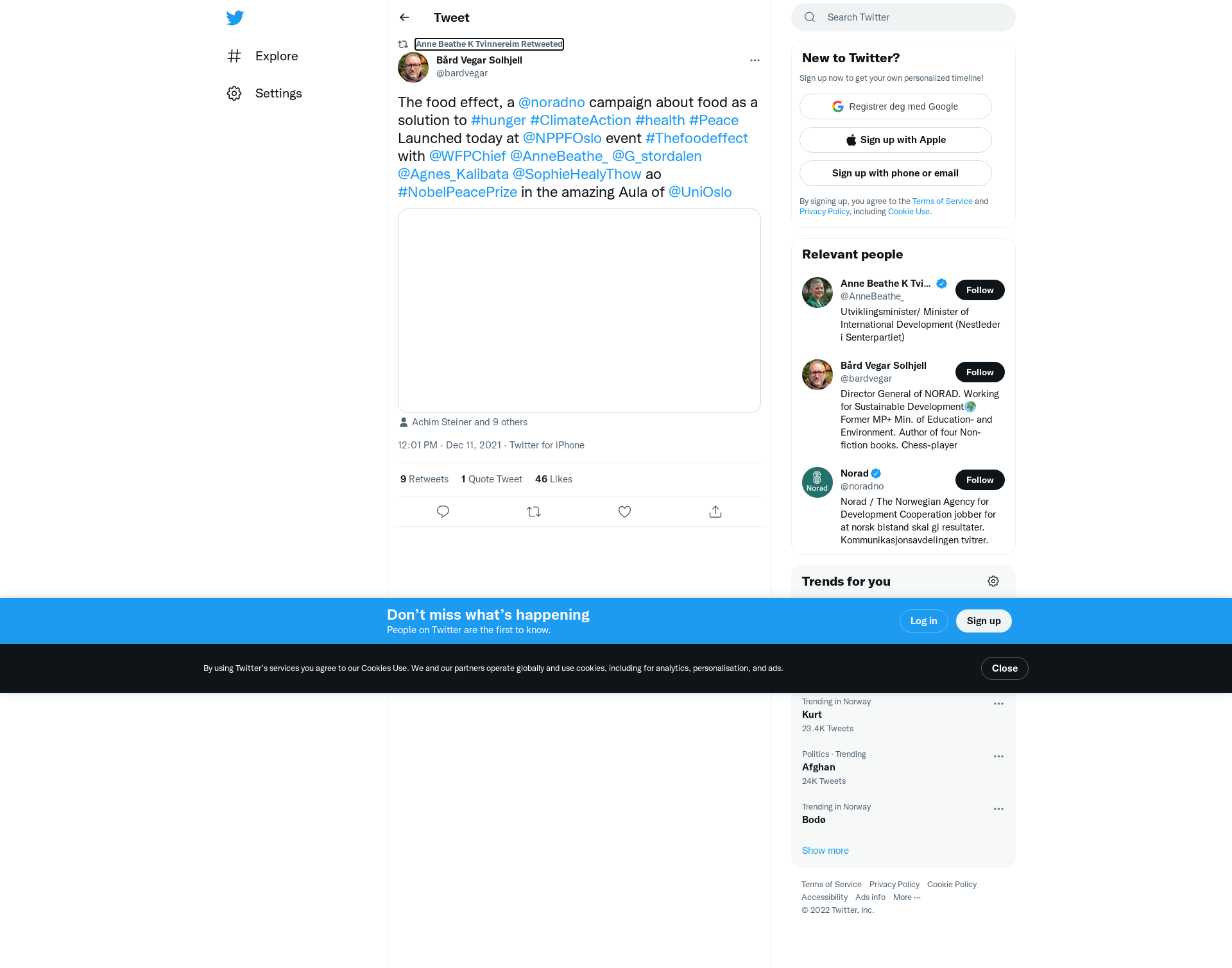 RT @bardvegar: The food effect, a @noradno campaign about food as a solution to #hunger #ClimateAction #health #Peace Launched today at @NPPFOslo event #Thefoodeffect with @WFPChief @AnneBeathe_ @G_stordalen @Agnes_Kalibata @SophieHealyThow ao #NobelPeacePrize in the amazing Aula of @UniOslo https://t.co/nqGYW9hv8o