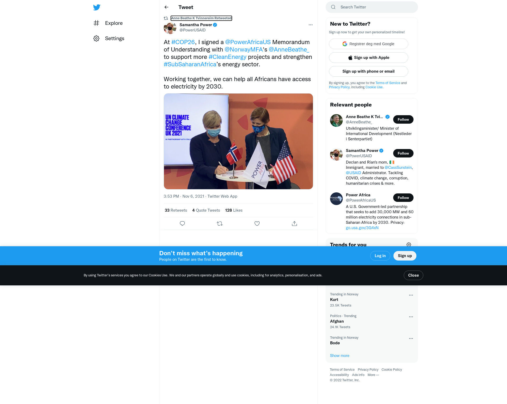RT @PowerUSAID: At #COP26, I signed a @PowerAfricaUS Memorandum of Understanding with @NorwayMFA's @AnneBeathe_ to support more #CleanEnergy projects and strengthen #SubSaharanAfrica’s energy sector. \n\nWorking together, we can help all Africans have access to electricity by 2030. https://t.co/2mFndFciRD