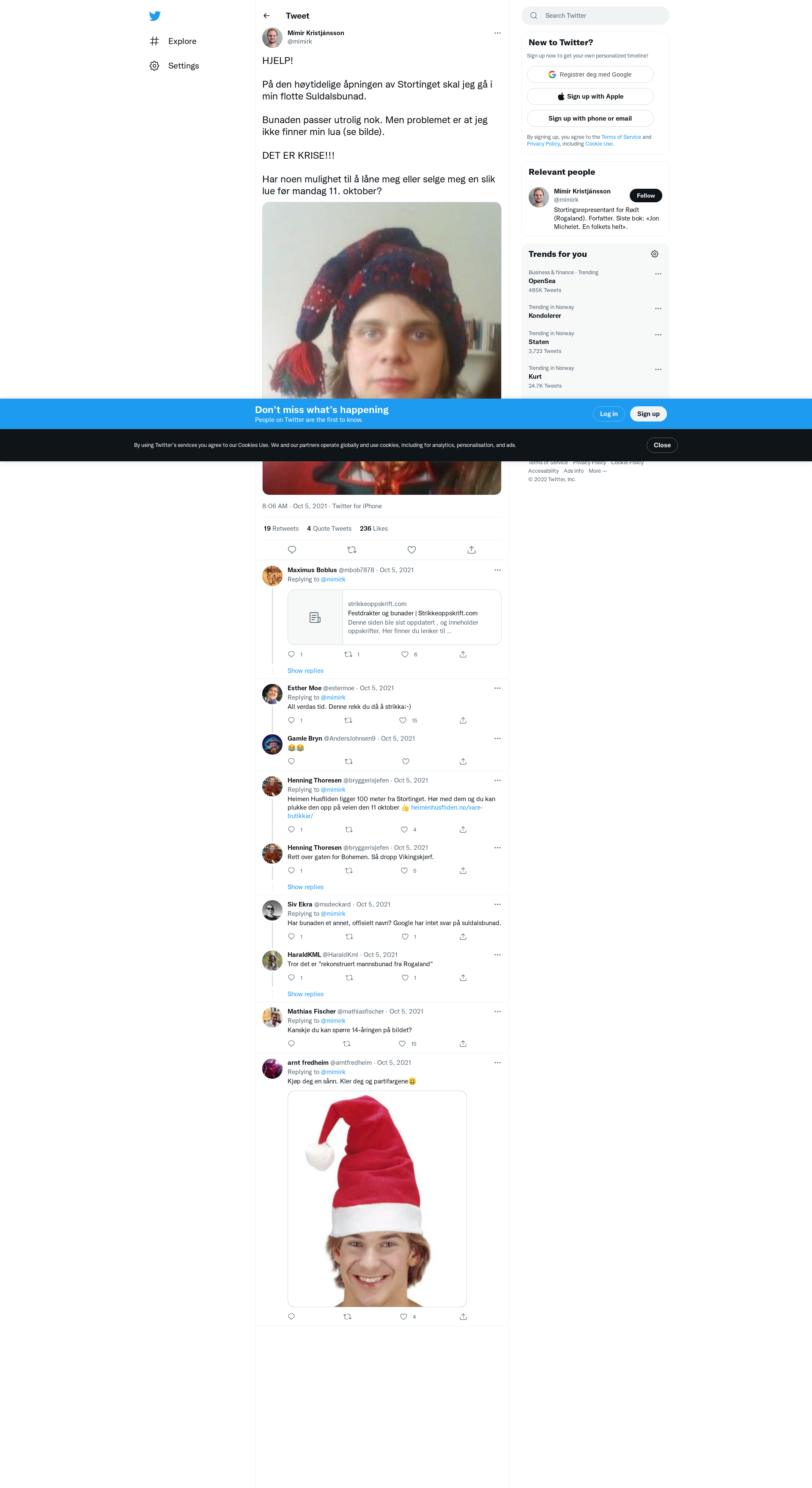HJELP! \n\nPå den høytidelige åpningen av Stortinget skal jeg gå i min flotte Suldalsbunad.\n\nBunaden passer utrolig nok. Men problemet er at jeg ikke finner min lua (se bilde). \n\nDET ER KRISE!!!\n\nHar noen mulighet til å låne meg eller selge meg en slik lue før mandag 11. oktober? https://t.co/oz0CUfKhxk