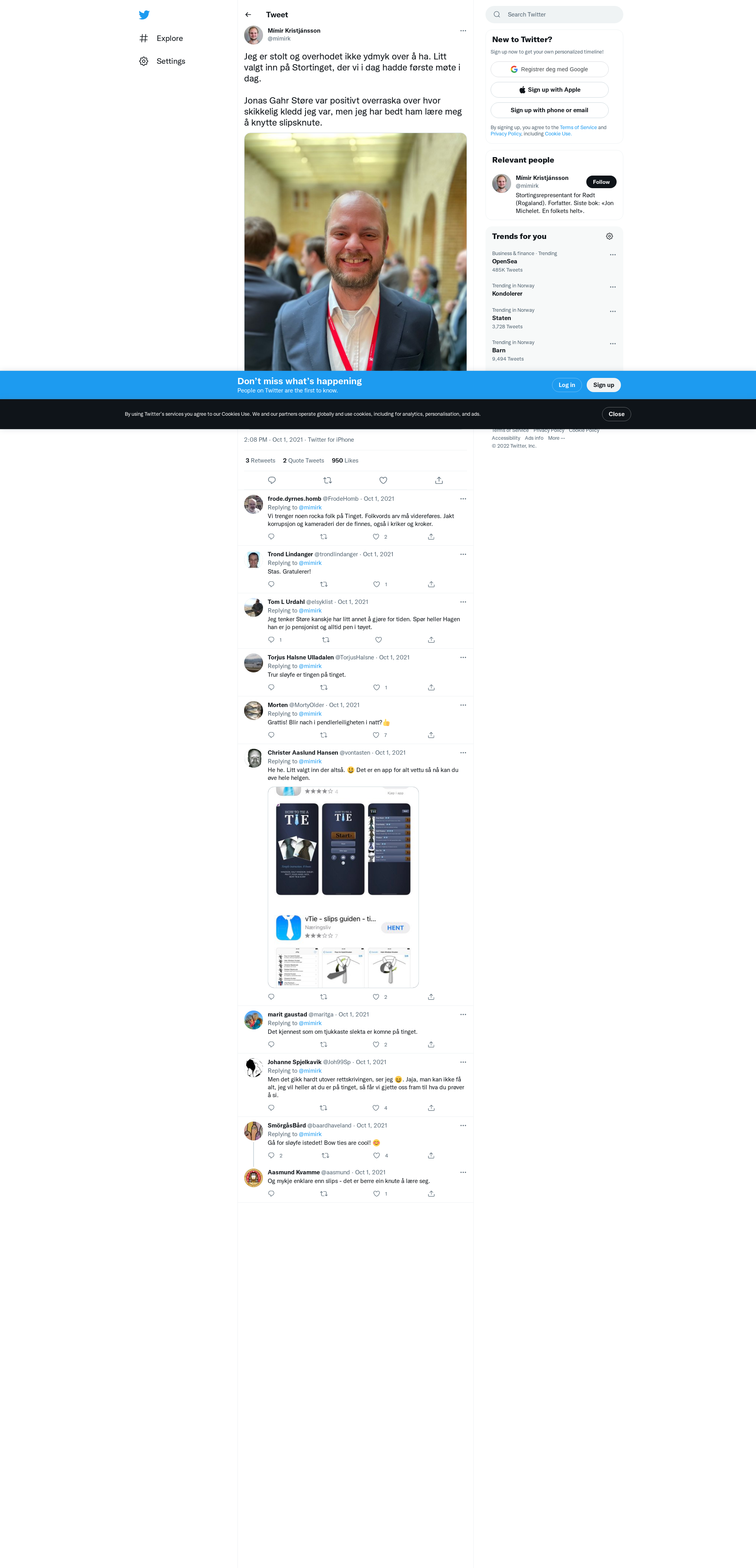 Jeg er stolt og overhodet ikke ydmyk over å ha. Litt valgt inn på Stortinget, der vi i dag hadde første møte i dag. \n\nJonas Gahr Støre var positivt overraska over hvor skikkelig kledd jeg var, men jeg har bedt ham lære meg å knytte slipsknute. https://t.co/ollgSUrf4X