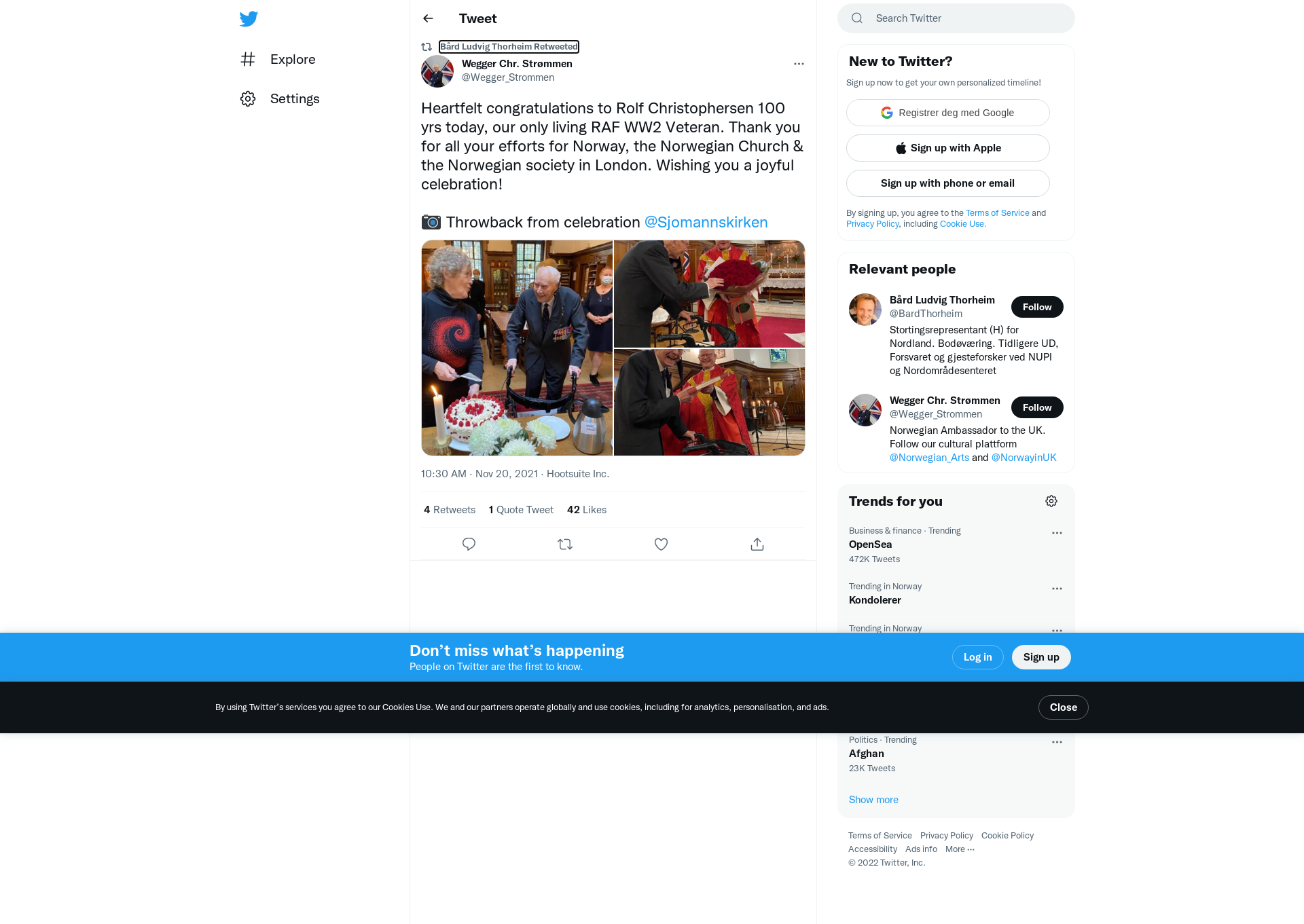 RT @Wegger_Strommen: Heartfelt congratulations to Rolf Christophersen 100 yrs today, our only living RAF WW2 Veteran. Thank you for all your efforts for Norway, the Norwegian Church & the Norwegian society in London. Wishing you a joyful celebration! \n\n📷 Throwback from celebration @Sjomannskirken https://t.co/NcDCSDAKMG