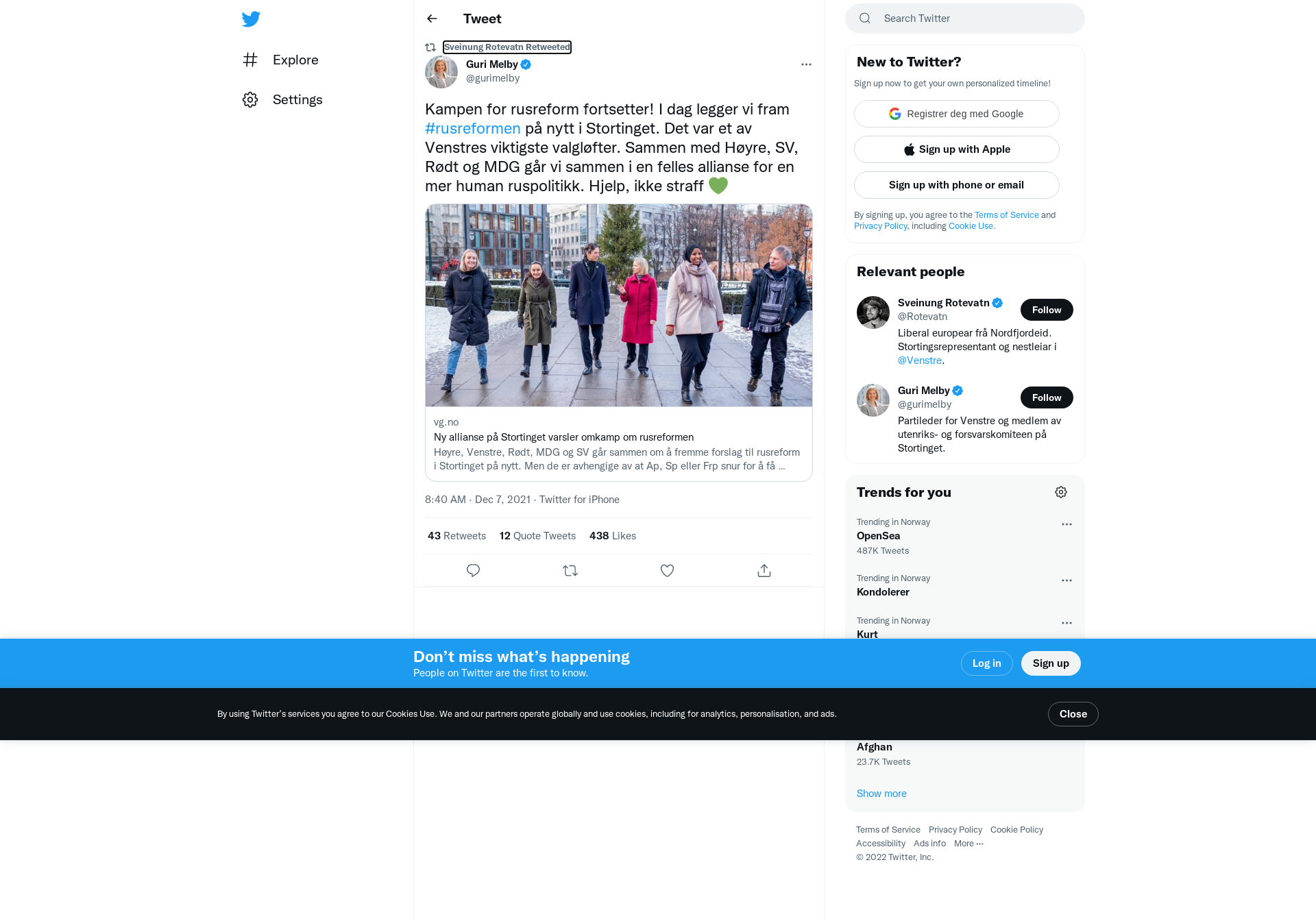 RT @gurimelby: Kampen for rusreform fortsetter! I dag legger vi fram #rusreformen på nytt i Stortinget. Det var et av Venstres viktigste valgløfter. Sammen med Høyre, SV, Rødt og MDG går vi sammen i en felles allianse for en mer human ruspolitikk. Hjelp, ikke straff 💚\nhttps://t.co/aDjTWIOTiE