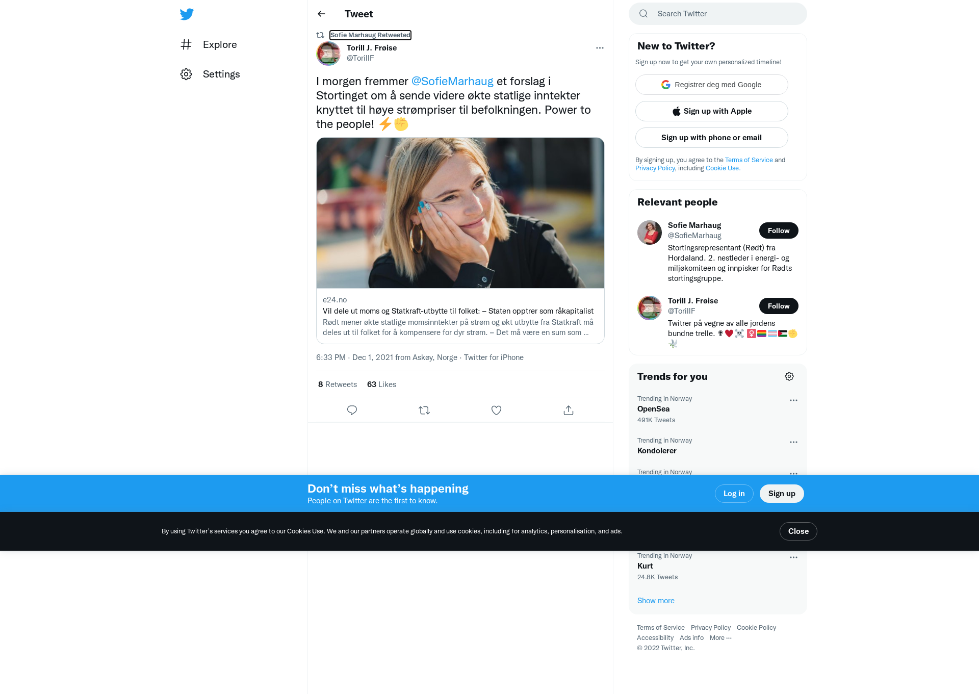 RT @TorillF: I morgen fremmer @SofieMarhaug et forslag i Stortinget om å sende videre økte statlige inntekter knyttet til høye strømpriser til befolkningen. Power to the people! ⚡️✊\n\nhttps://t.co/HtI9ln1FNY