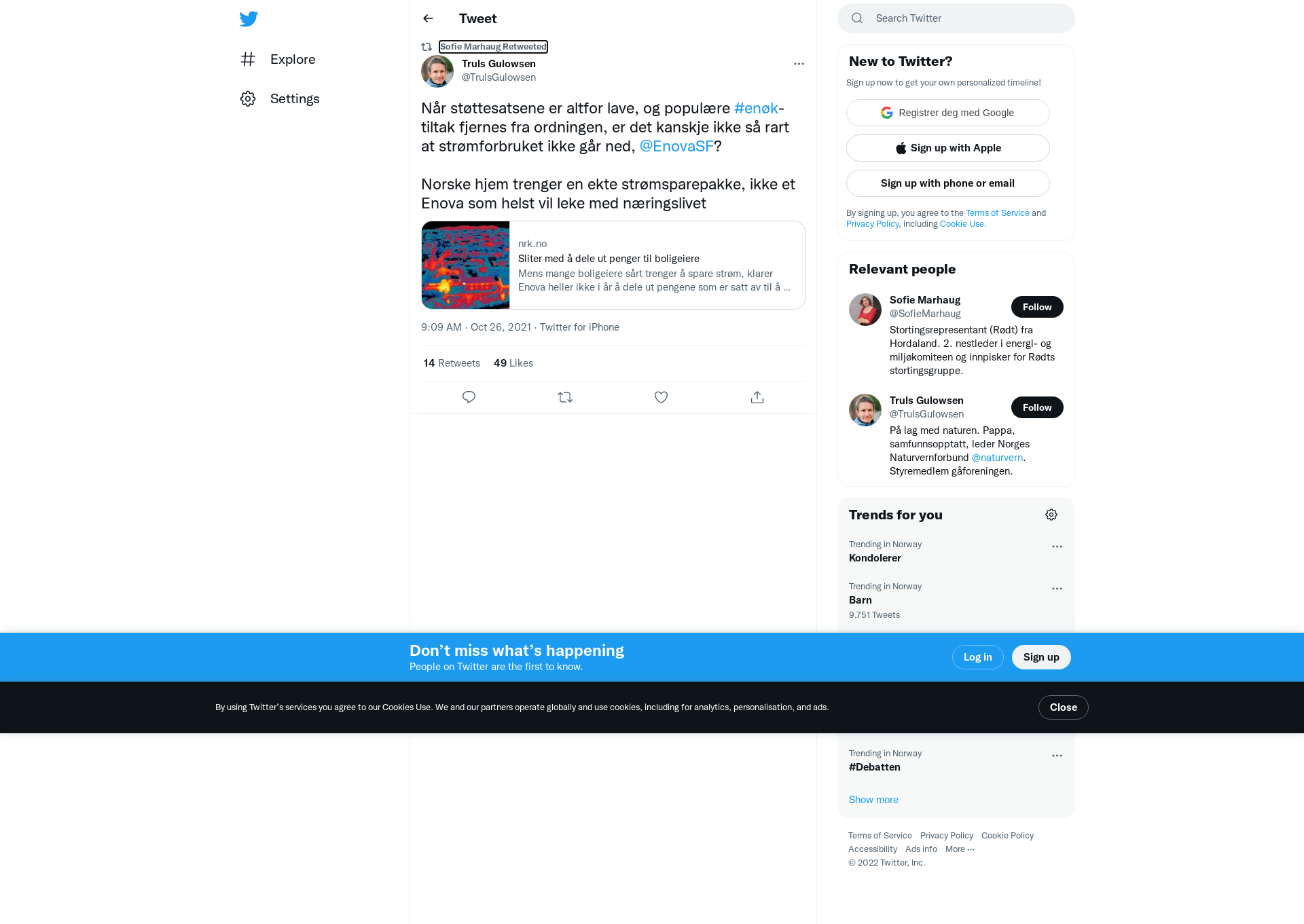 RT @TrulsGulowsen: Når støttesatsene er altfor lave, og populære #enøk-tiltak fjernes fra ordningen, er det kanskje ikke så rart at strømforbruket ikke går ned, @EnovaSF? \n\nNorske hjem trenger en ekte strømsparepakke, ikke et Enova som helst vil leke med næringslivet https://t.co/hDyItN99fe