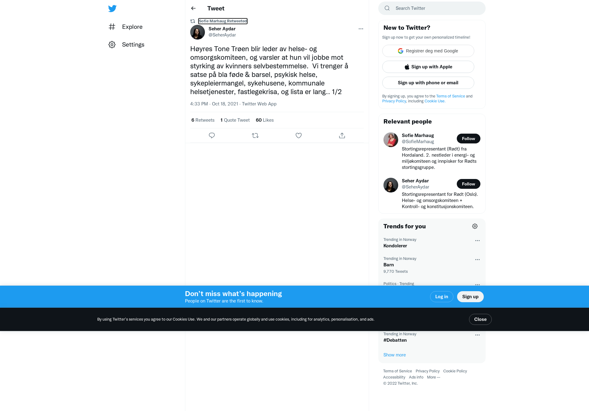 RT @SeherAydar: Høyres Tone Trøen blir leder av helse- og omsorgskomiteen, og varsler at hun vil jobbe mot styrking av kvinners selvbestemmelse. Vi trenger å satse på bla føde & barsel, psykisk helse, sykepleiermangel, sykehusene, kommunale helsetjenester, fastlegekrisa, og lista er lang.. 1/2