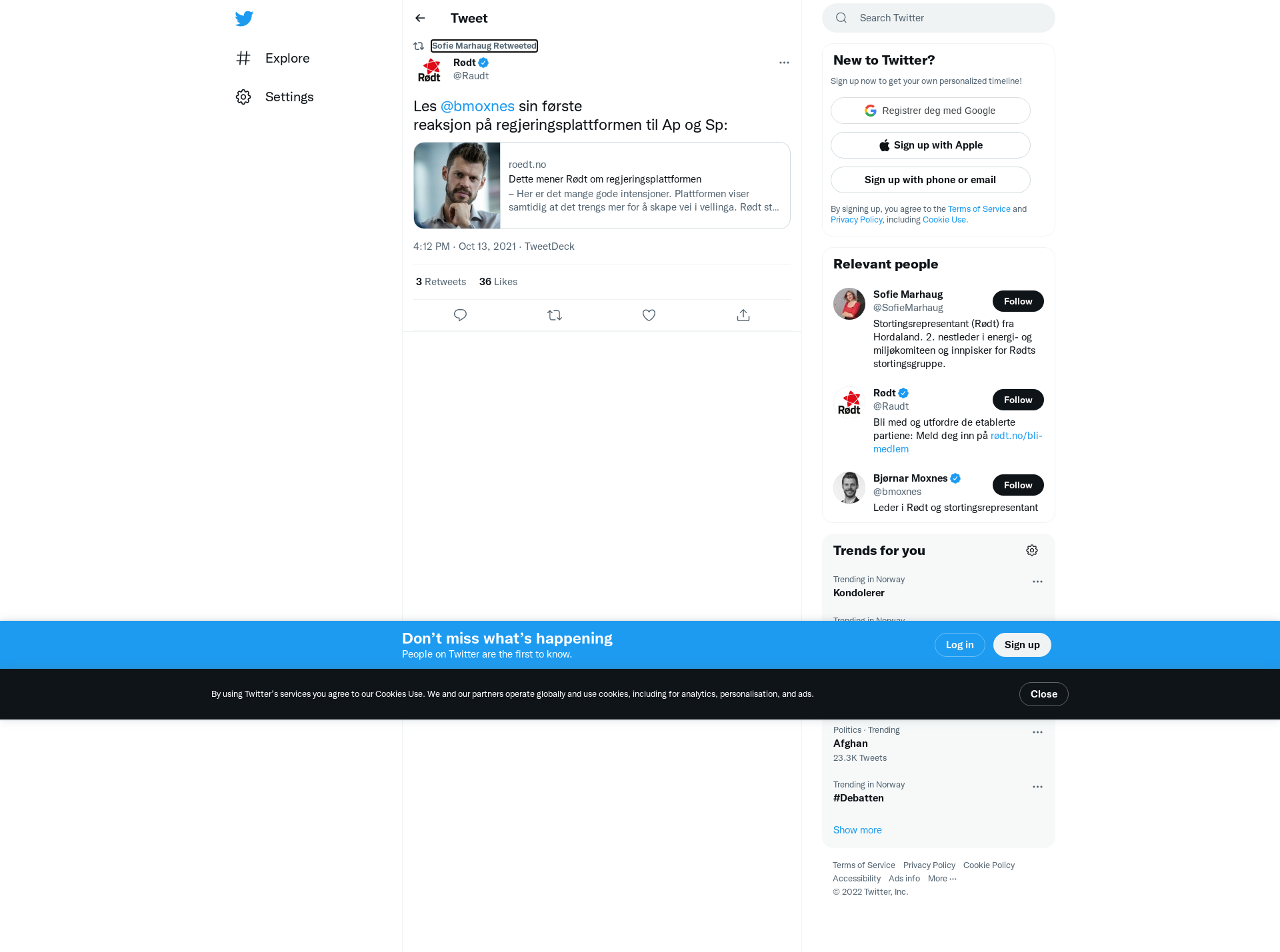 – Her er det mange gode intensjoner. Plattformen viser samtidig at det trengs mer for å skape vei i vellinga. Rødt står klare med forslagene som trengs for å ta Norge i riktig retning, sier Bjørnar Moxnes, leder i Rødt.