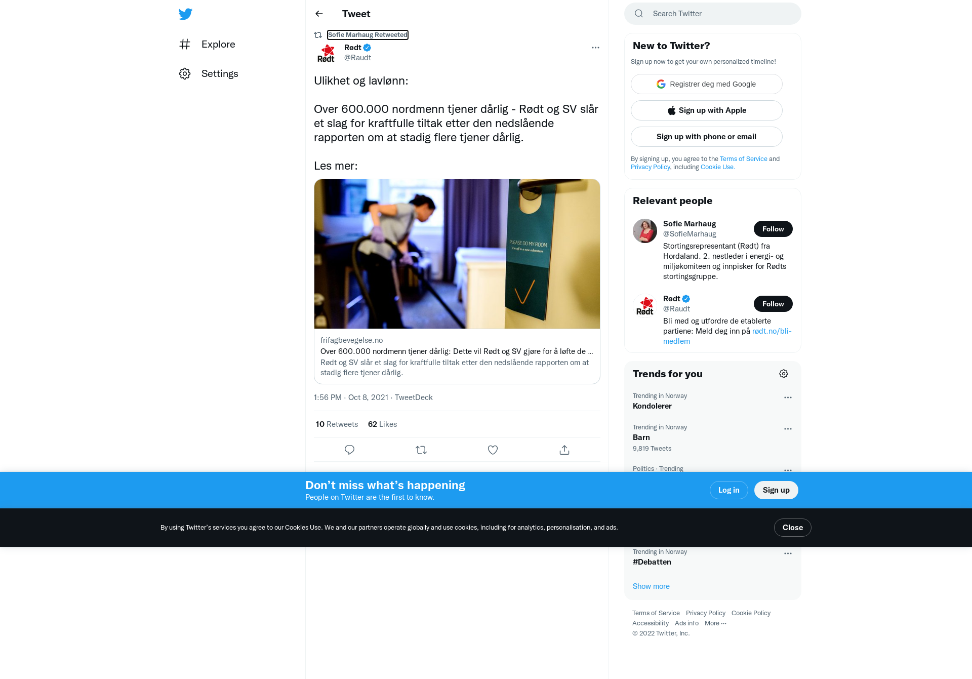 RT @Raudt: Ulikhet og lavlønn:\n\nOver 600.000 nordmenn tjener dårlig - Rødt og SV slår et slag for kraftfulle tiltak etter den nedslående ra…