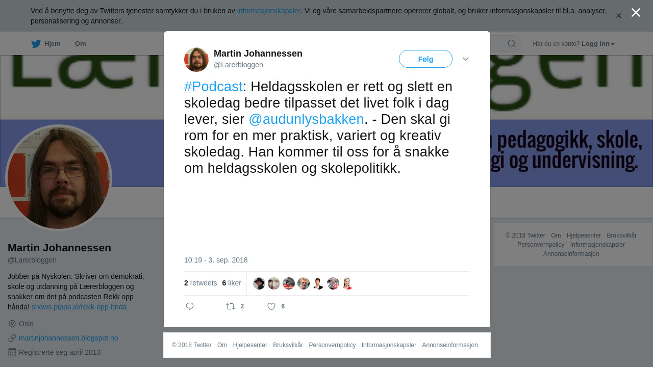 RT @Larerbloggen: #Podcast: Heldagsskolen er rett og slett en skoledag bedre tilpasset det livet folk i dag lever, sier @audunlysbakken. - Den skal gi rom for en mer praktisk, variert og kreativ skoledag. Han kommer til oss for å snakke om heldagsskolen og skolepolitikk.