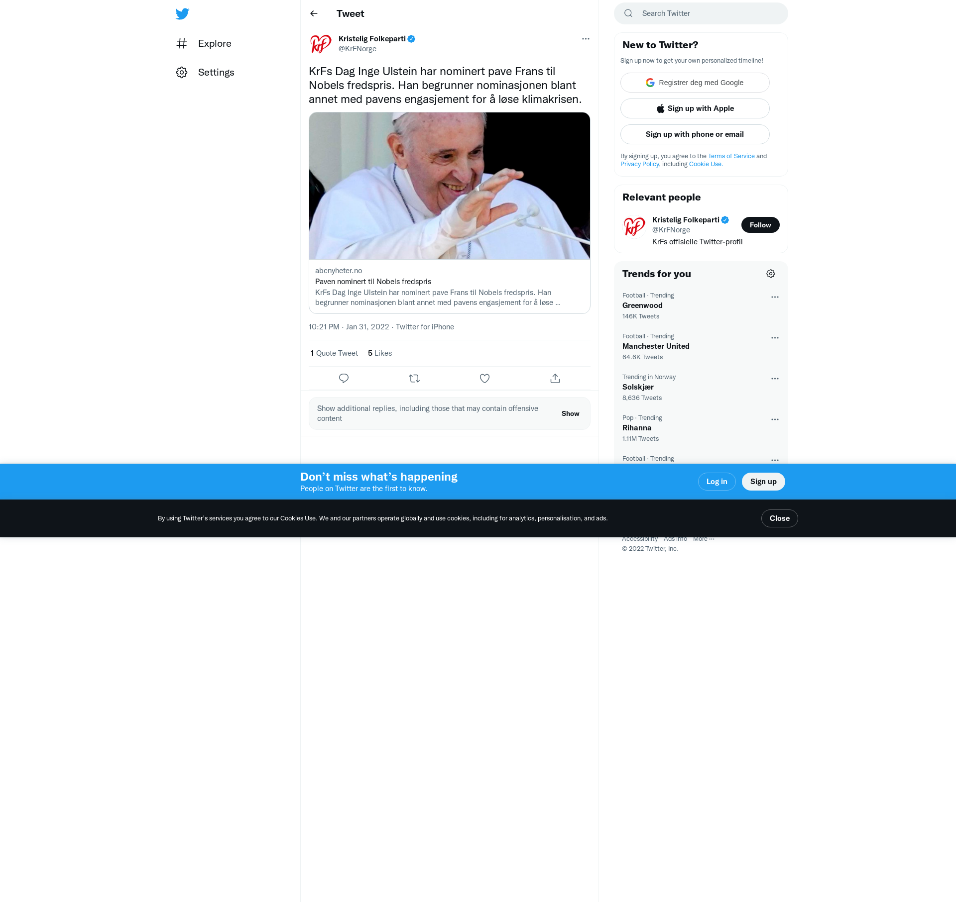KrFs Dag Inge Ulstein har nominert pave Frans til Nobels fredspris. Han begrunner nominasjonen blant annet med pavens engasjement for å løse klimakrisen.\nhttps://t.co/rhSMHjxFz1