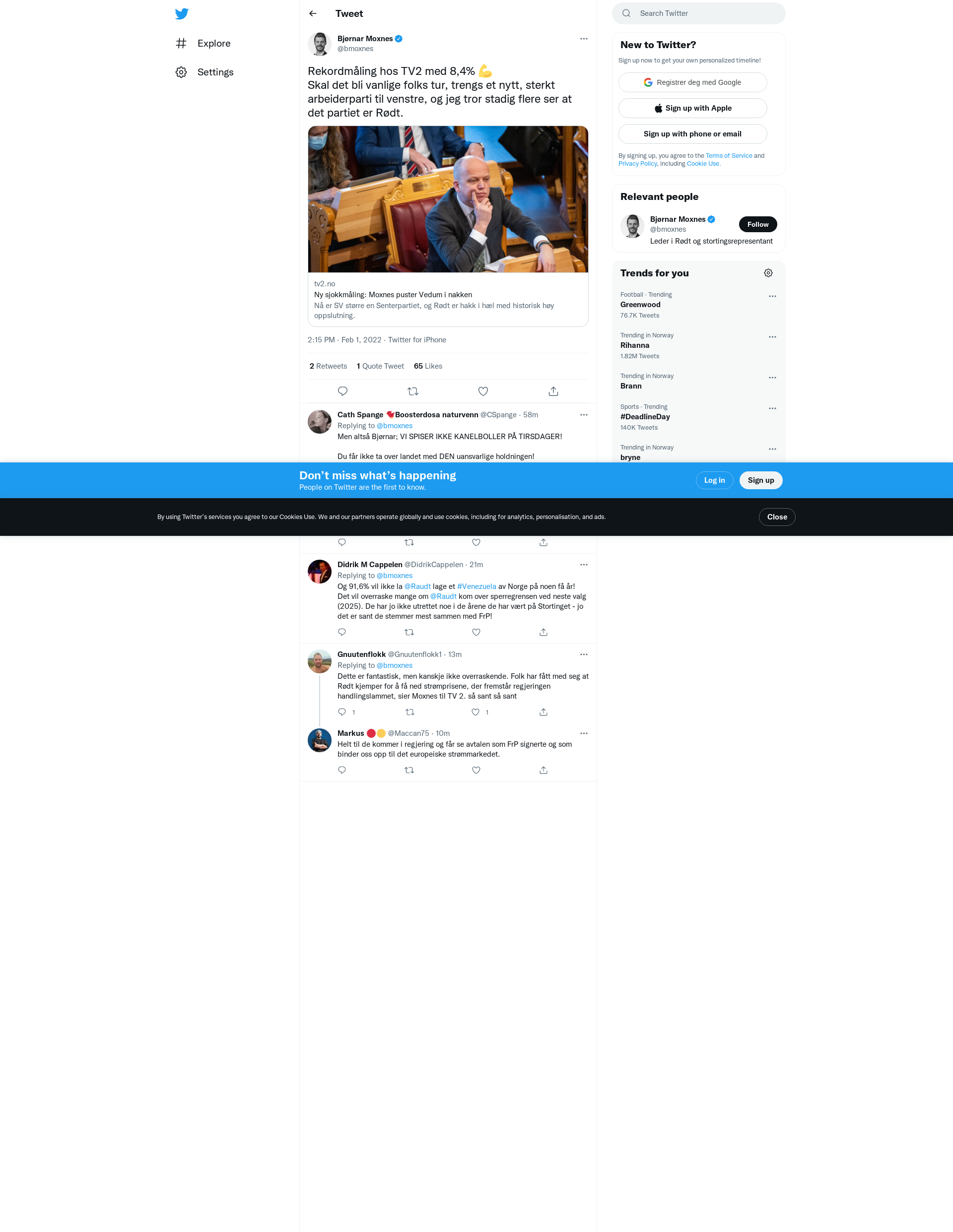 Rekordmåling hos TV2 med 8,4% 💪 \nSkal det bli vanlige folks tur, trengs et nytt, sterkt arbeiderparti til venstre, og jeg tror stadig flere ser at det partiet er Rødt. https://t.co/ZBAe0PheIi