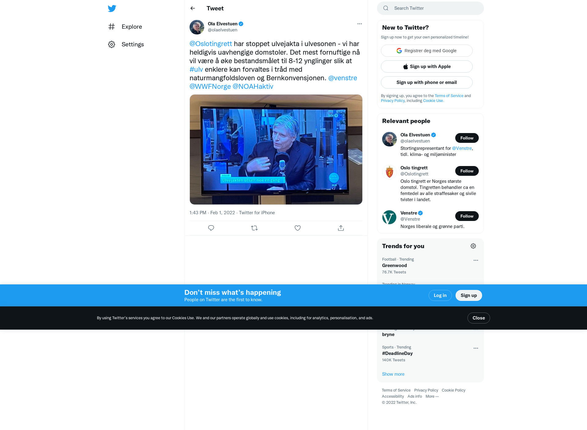 @Oslotingrett har stoppet ulvejakta i ulvesonen - vi har heldigvis uavhengige domstoler. Det mest fornuftige nå vil være å øke bestandsmålet til 8-12 ynglinger slik at #ulv enklere kan forvaltes i tråd med naturmangfoldsloven og Bernkonvensjonen. @venstre @WWFNorge @NOAHaktiv https://t.co/czk1XMnp4X