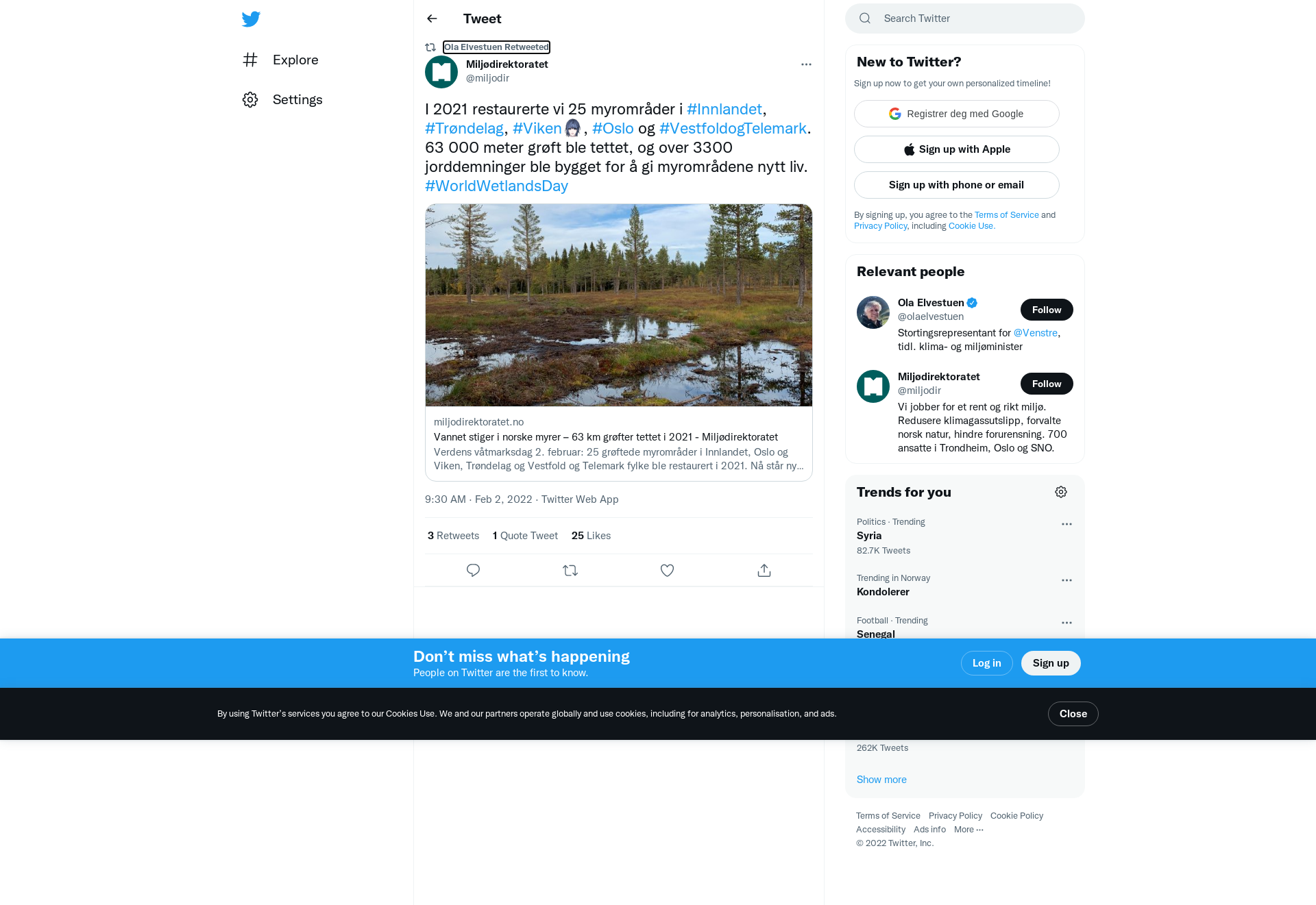 RT @miljodir: I 2021 restaurerte vi 25 myrområder i #Innlandet, #Trøndelag, #Viken, #Oslo og #VestfoldogTelemark. 63 000 meter grøft ble tettet, og over 3300 jorddemninger ble bygget for å gi myrområdene nytt liv. #WorldWetlandsDay \nhttps://t.co/1JrMW6GxqW