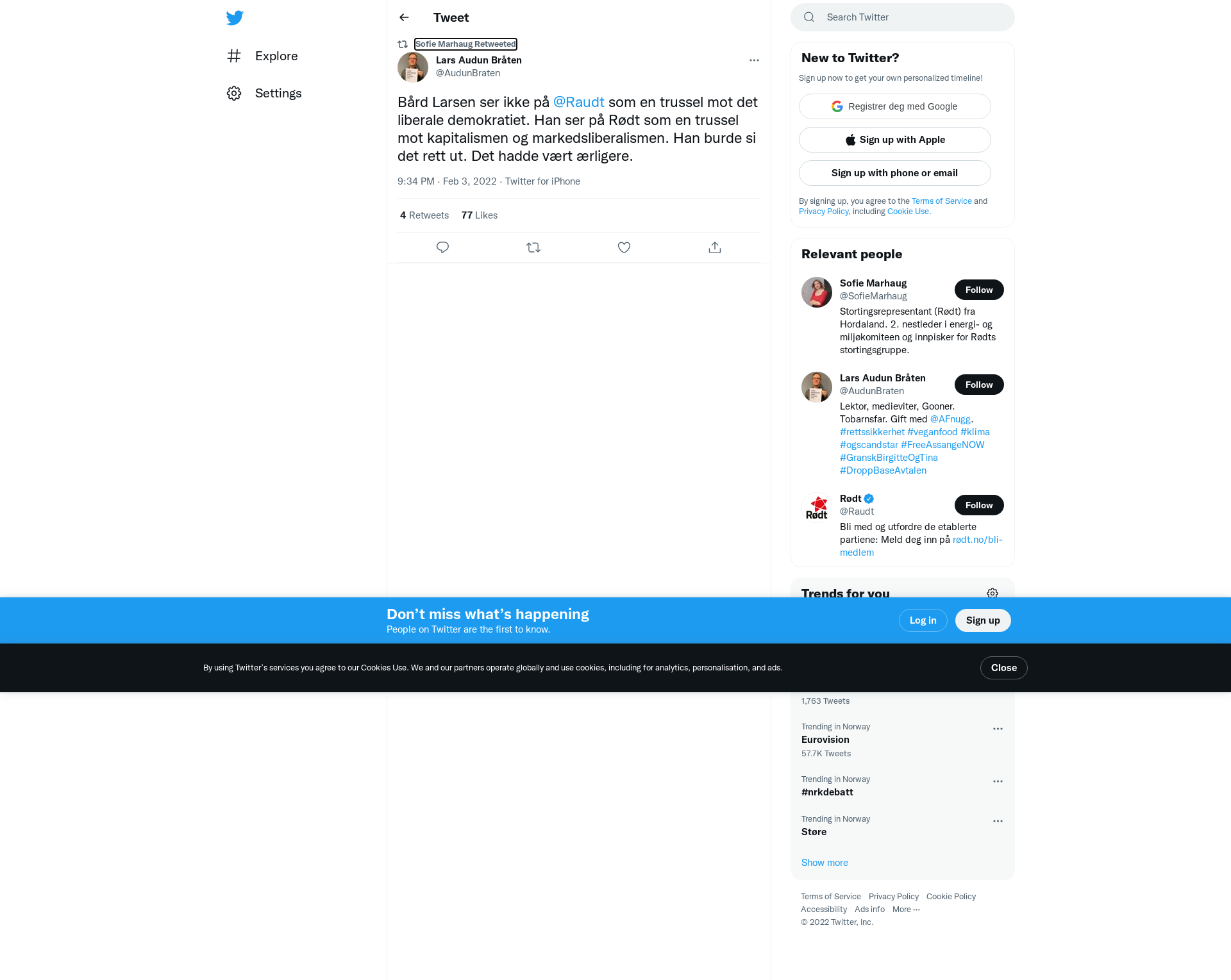 RT @AudunBraten: Bård Larsen ser ikke på @Raudt som en trussel mot det liberale demokratiet. Han ser på Rødt som en trussel mot kapitalismen og markedsliberalismen. Han burde si det rett ut. Det hadde vært ærligere.