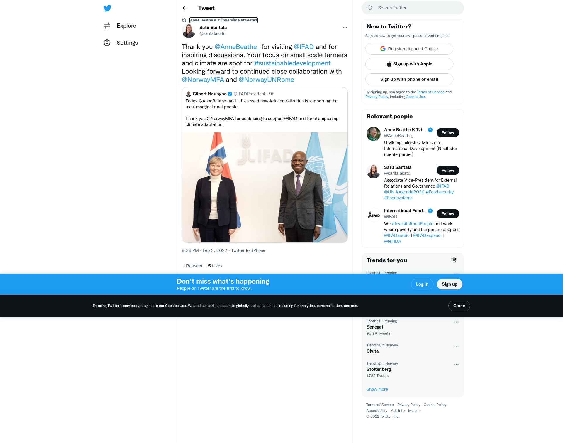 RT @santalasatu: Thank you @AnneBeathe_ for visiting @IFAD and for inspiring discussions. Your focus on small scale farmers and climate are spot for #sustainabledevelopment. Looking forward to continued close collaboration with @NorwayMFA and @NorwayUNRome
