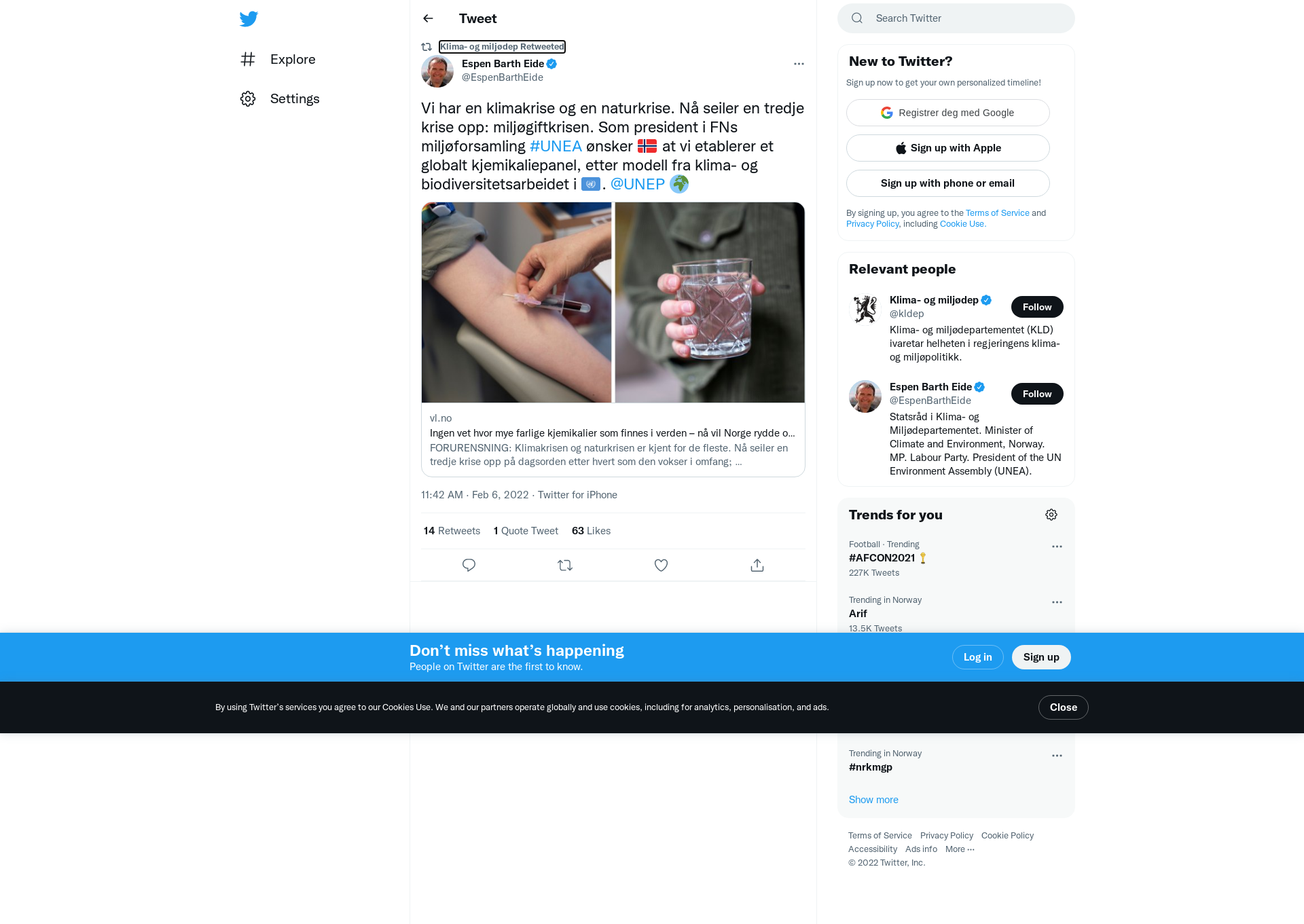 RT @EspenBarthEide: Vi har en klimakrise og en naturkrise. Nå seiler en tredje krise opp: miljøgiftkrisen. Som president i FNs miljøforsamling #UNEA ønsker 🇳🇴 at vi etablerer et globalt kjemikaliepanel, etter modell fra klima- og biodiversitetsarbeidet i 🇺🇳. @UNEP 🌍 https://t.co/J6ZWsNDoUH