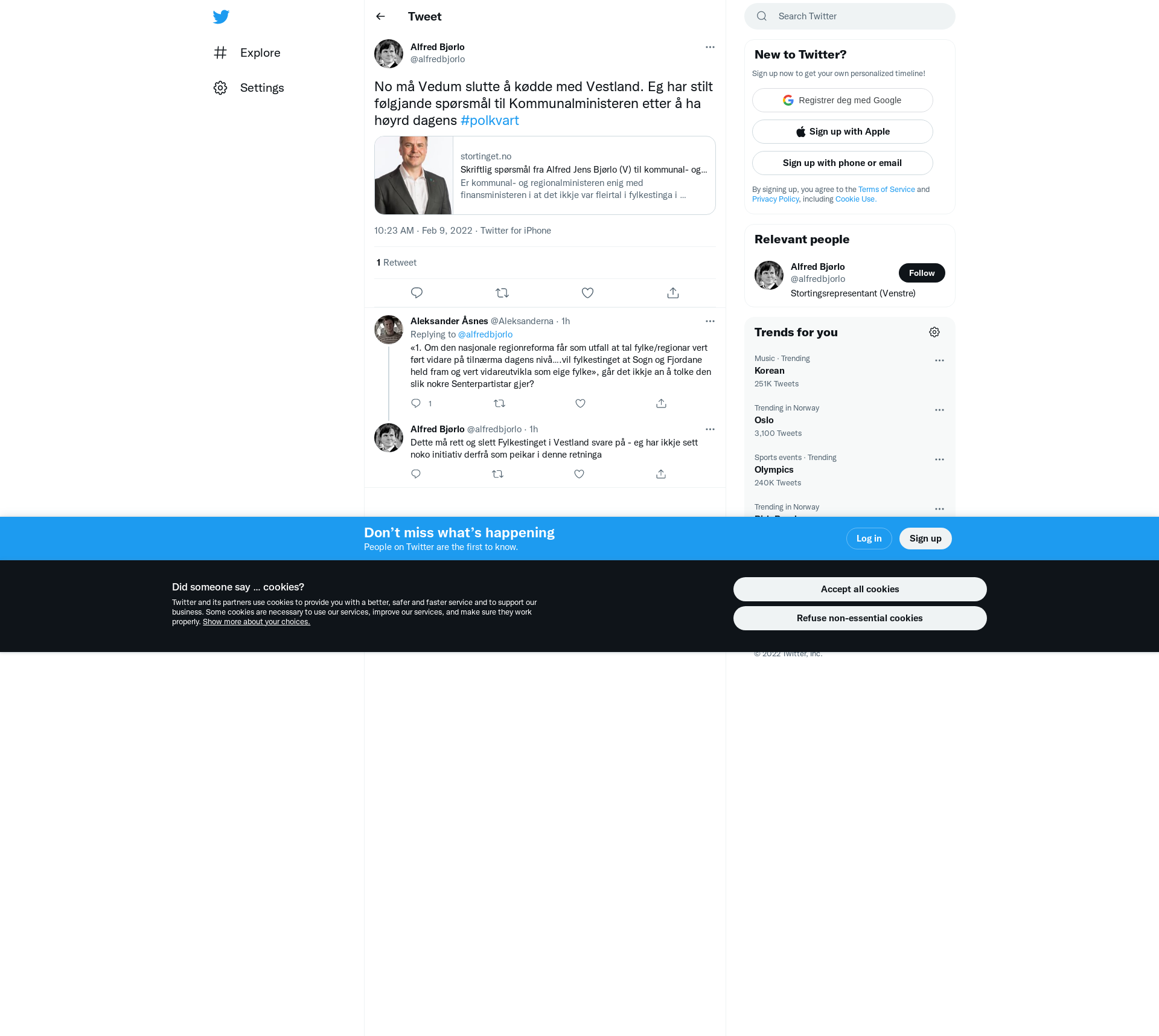 Skriftlig spørsmål fra Alfred Jens Bjørlo (V) til kommunal- og distriktsministeren