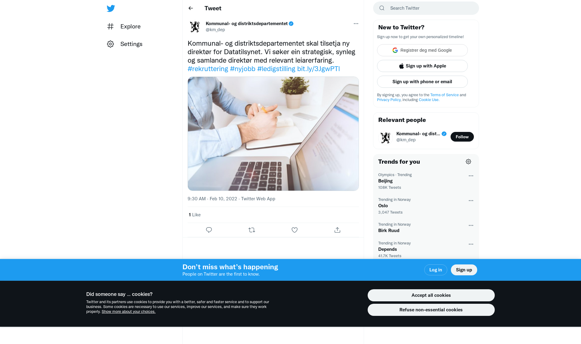 Kommunal- og distriktsdepartementet skal tilsetja ny direktør for Datatilsynet. Vi søker ein strategisk, synleg og samlande direktør med relevant leiarerfaring. #rekruttering #nyjobb #ledigstilling https://t.co/NGe6sJS8jb https://t.co/4eEd5UoPVo