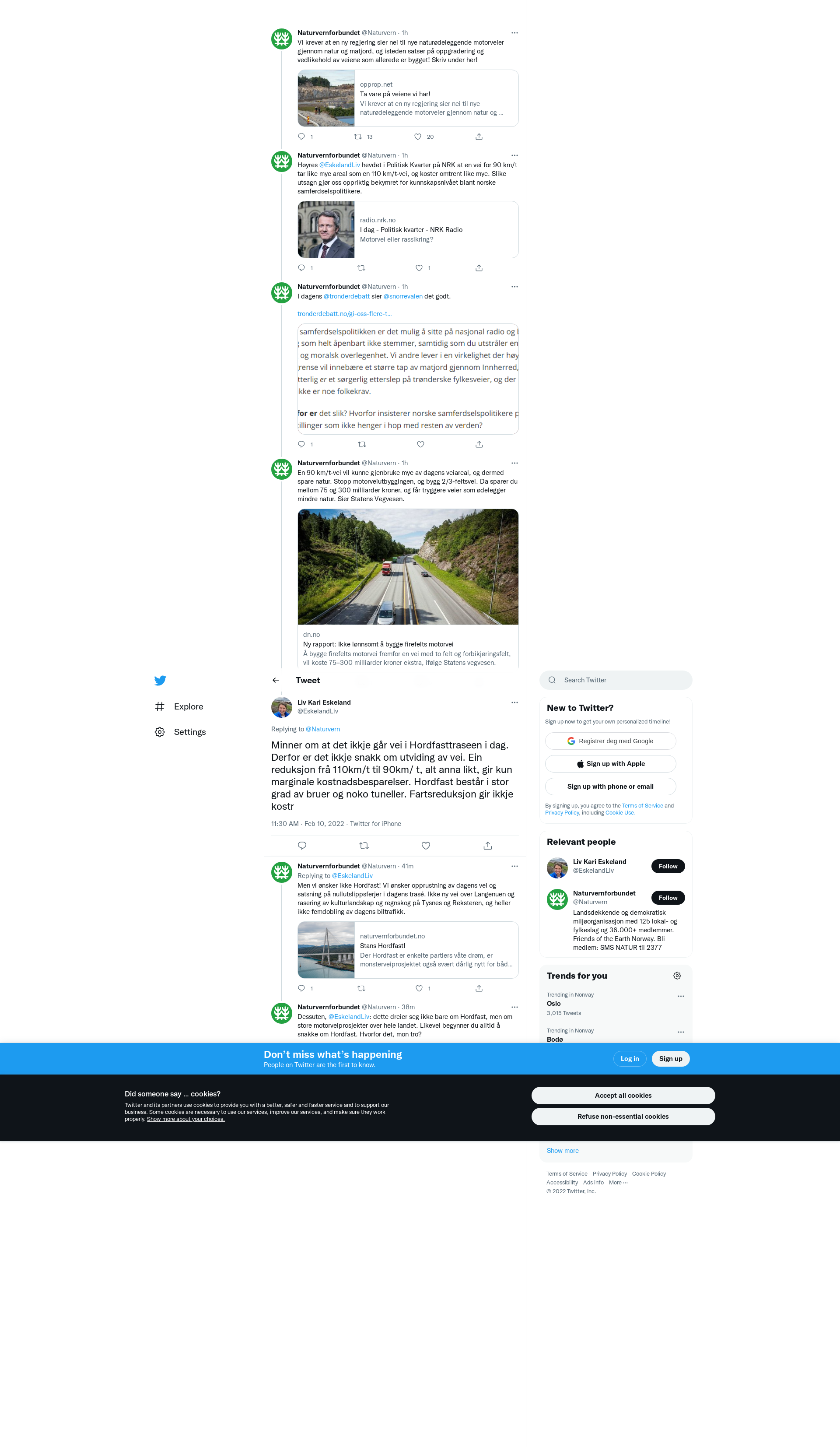 @Naturvern Minner om at det ikkje går vei i Hordfasttraseen i dag. Derfor er det ikkje snakk om utviding av vei. Ein reduksjon frå 110km/t til 90km/ t, alt anna likt, gir kun marginale kostnadsbesparelser. Hordfast består i stor grad av bruer og noko tuneller. Fartsreduksjon gir ikkje kostr