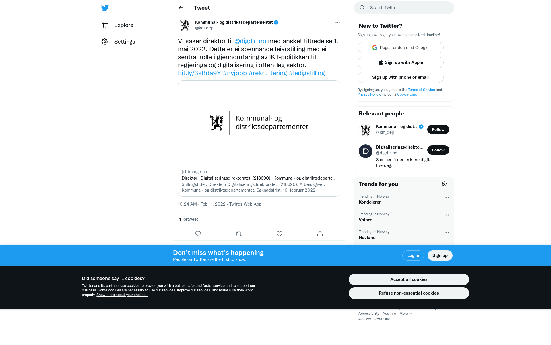 Vi søker direktør til @digdir_no med ønsket tiltredelse 1. mai 2022. Dette er ei spennande leiarstilling med ei sentral rolle i gjennomføring av IKT-politikken til regjeringa og digitalisering i offentleg sektor. https://t.co/dqY1fBWbRL #nyjobb #rekruttering #ledigstilling