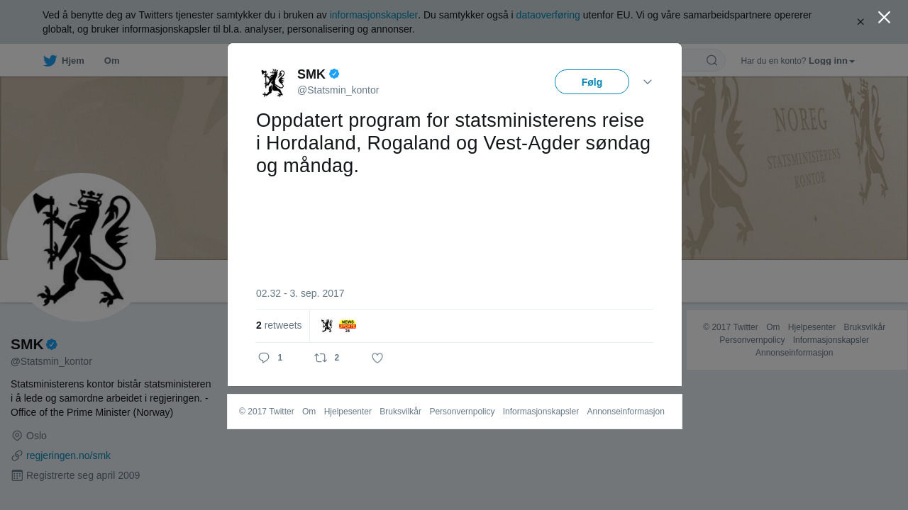 Statsministeren og statsrådane har normalt desse faste postane i vekeprogrammet: Regjeringskonferanse torsdag kl. 12.30 og statsråd på Slottet fredag kl. 11.00. Statsminister Erna Solberg er på rundreise i Trøndelag, Møre- og Romsdal, Hordaland, Rogala...