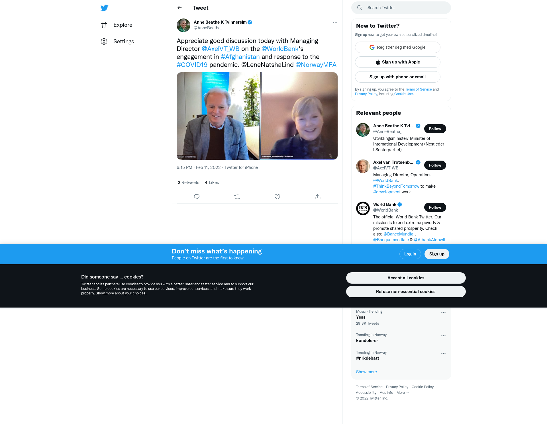 Appreciate good discussion today with Managing Director @AxelVT_WB on the @WorldBank's engagement in #Afghanistan and response to the #COVID19 pandemic. @LeneNatshaLind @NorwayMFA https://t.co/y2XcqcPvoh