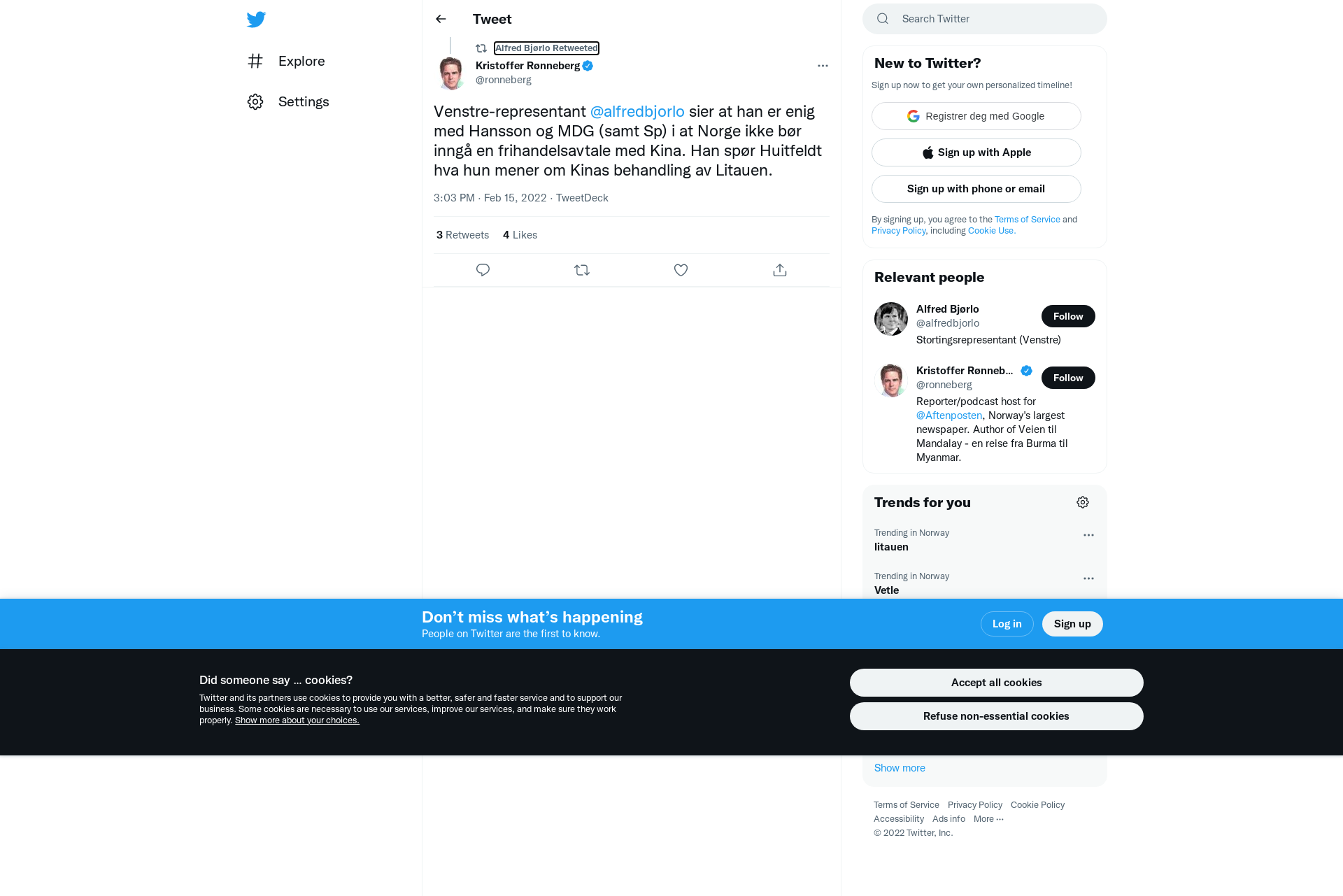RT @ronneberg: Venstre-representant @alfredbjorlo sier at han er enig med Hansson og MDG (samt Sp) i at Norge ikke bør inngå en frihandelsavtale med Kina. Han spør Huitfeldt hva hun mener om Kinas behandling av Litauen.
