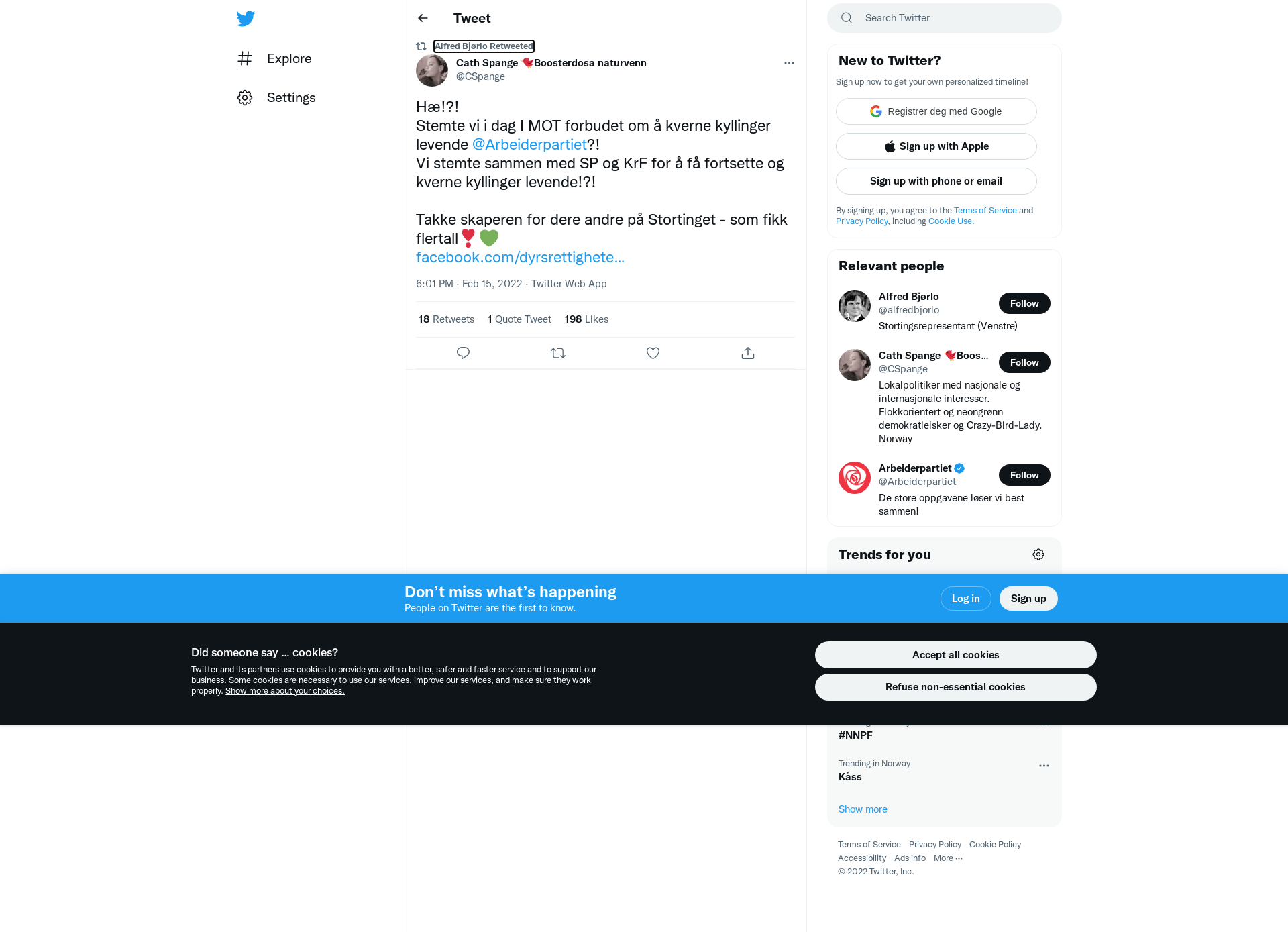 RT @CSpange: Hæ!?!\nStemte vi i dag I MOT forbudet om å kverne kyllinger levende @Arbeiderpartiet?!\nVi stemte sammen med SP og KrF for å få…