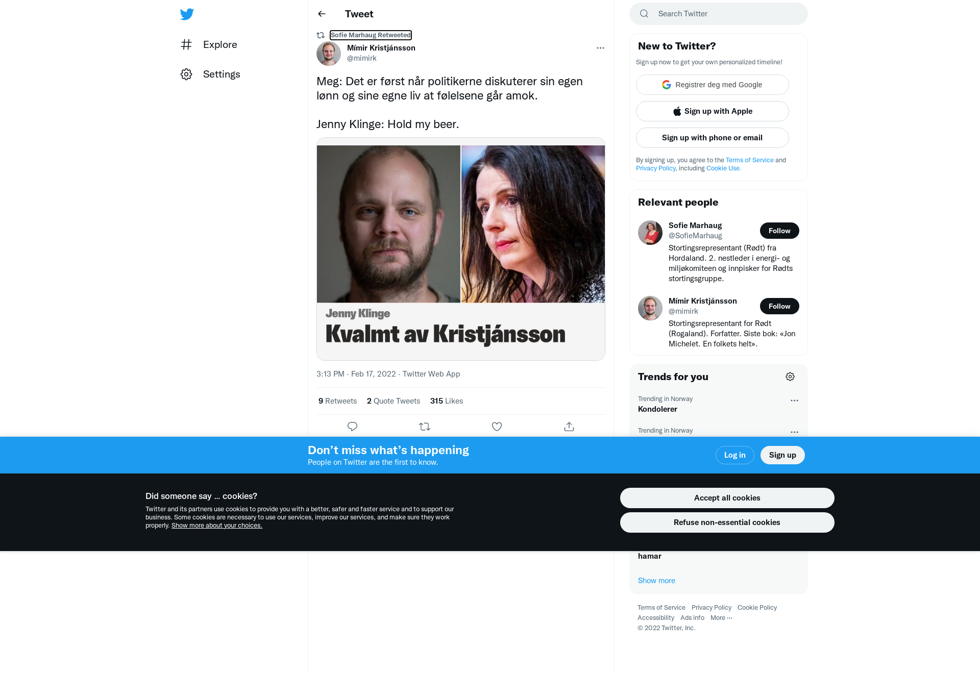 RT @mimirk: Meg: Det er først når politikerne diskuterer sin egen lønn og sine egne liv at følelsene går amok.\n\nJenny Klinge: Hold my beer.…