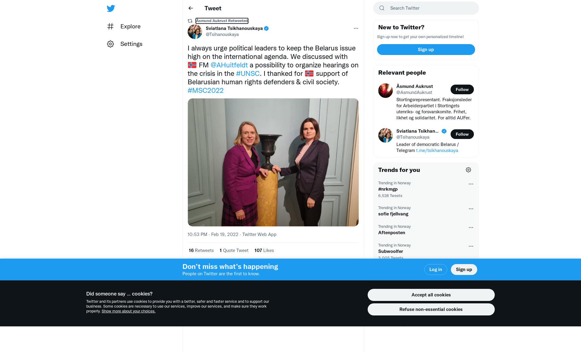 RT @Tsihanouskaya: I always urge political leaders to keep the Belarus issue high on the international agenda. We discussed with 🇳🇴 FM @AHuitfeldt a possibility to organize hearings on the crisis in the #UNSC. I thanked for 🇳🇴 support of Belarusian human rights defenders & civil society. #MSC2022 https://t.co/VXoFIGy7dr