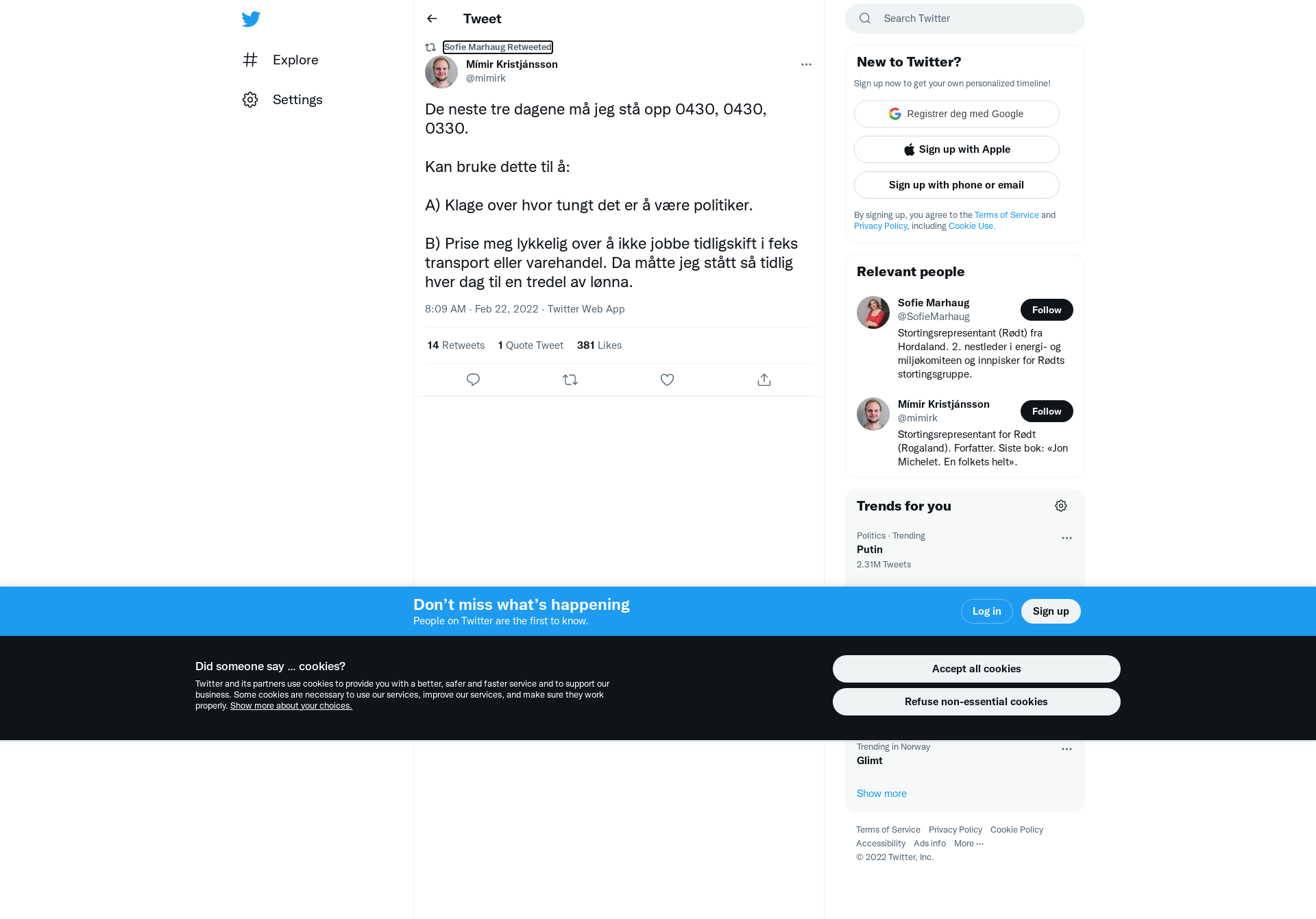 RT @mimirk: De neste tre dagene må jeg stå opp 0430, 0430, 0330. \n\nKan bruke dette til å: \n\nA) Klage over hvor tungt det er å være politike…