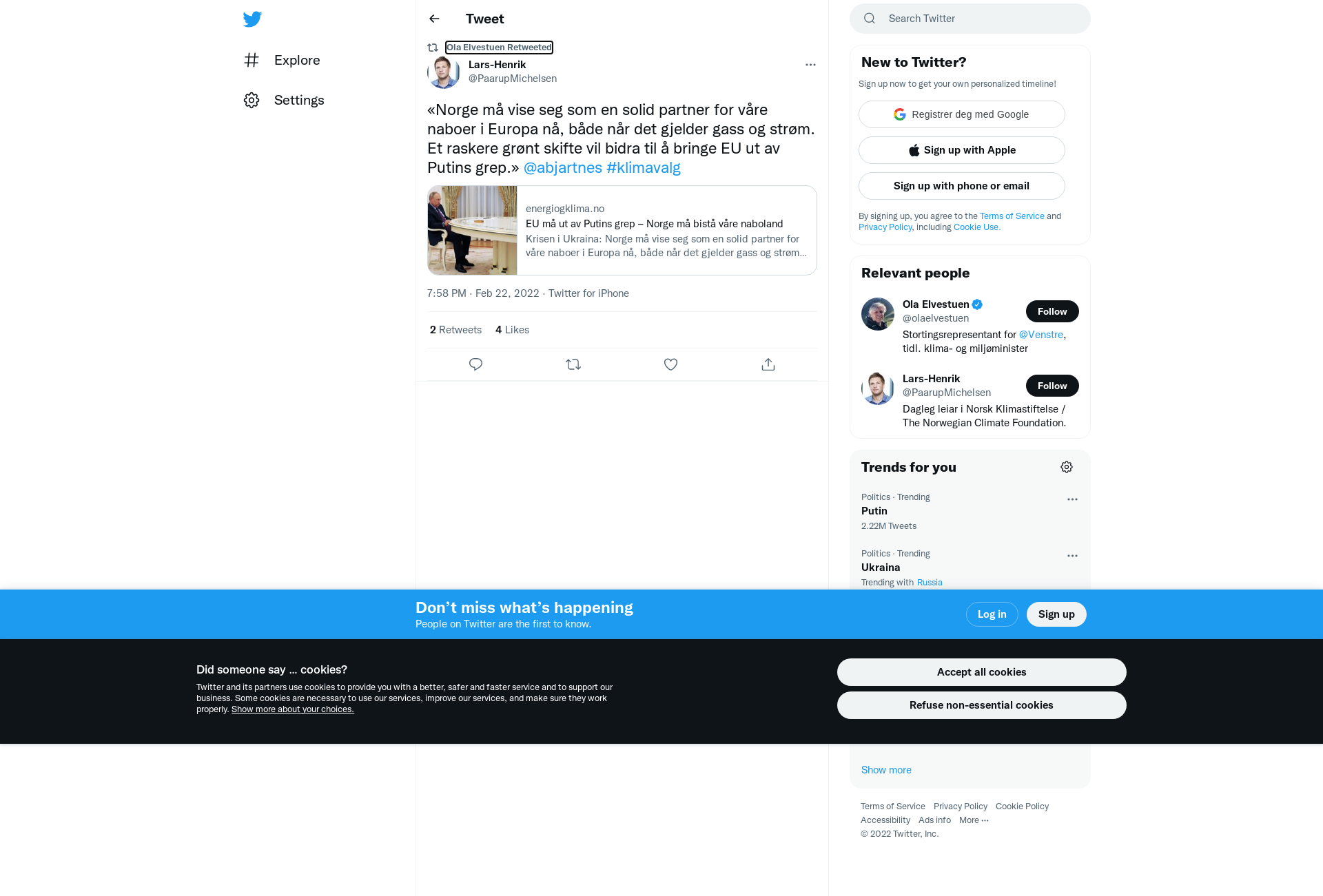 RT @PaarupMichelsen: «Norge må vise seg som en solid partner for våre naboer i Europa nå, både når det gjelder gass og strøm. Et raskere grønt skifte vil bidra til å bringe EU ut av Putins grep.» @abjartnes #klimavalg\n https://t.co/DfpVfQUfU8
