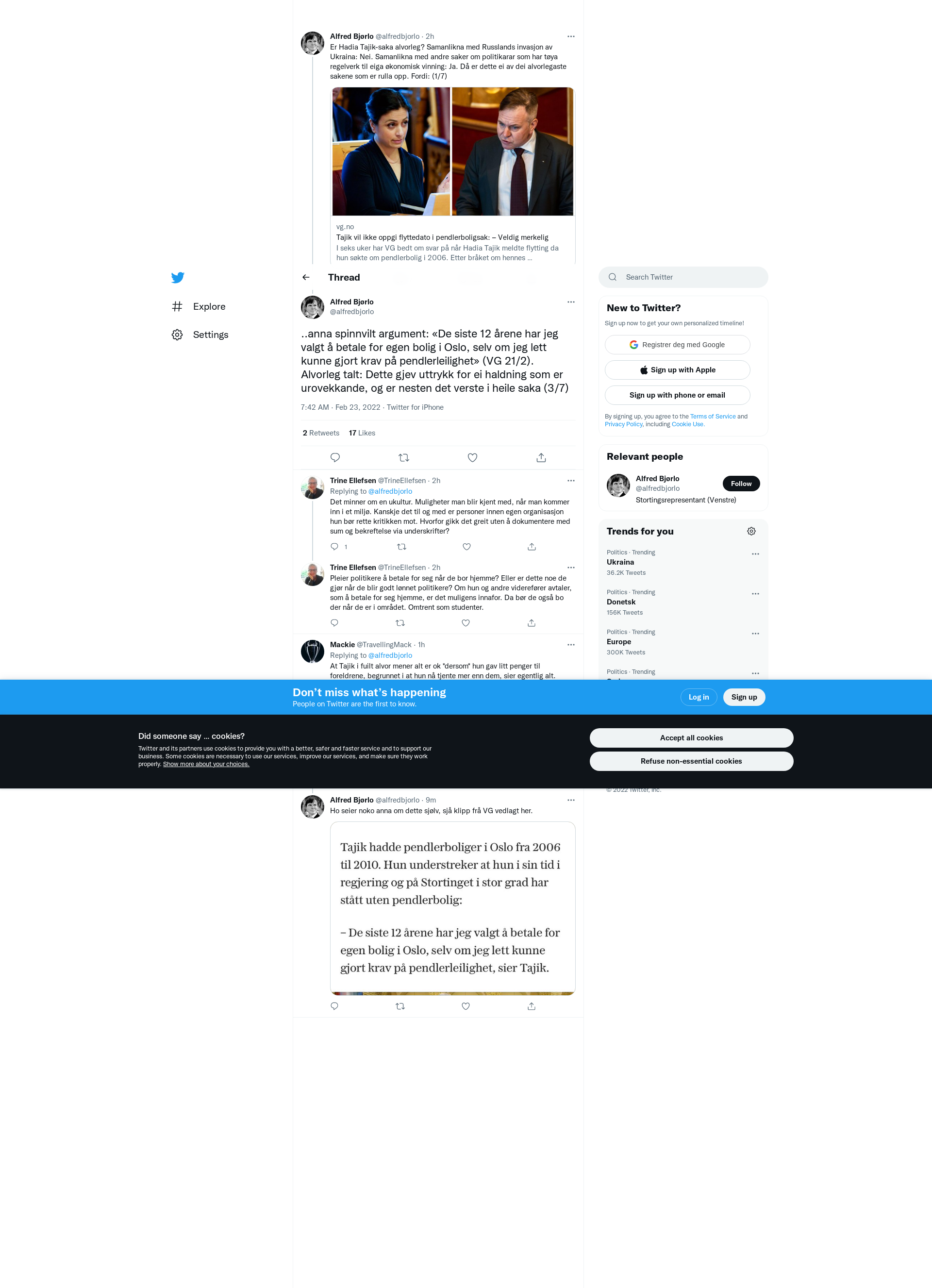 ..anna spinnvilt argument: «De siste 12 årene har jeg valgt å betale for egen bolig i Oslo, selv om jeg lett kunne gjort krav på pendlerleilighet» (VG 21/2).\nAlvorleg talt: Dette gjev uttrykk for ei haldning som er urovekkande, og er nesten det verste i heile saka (3/7)