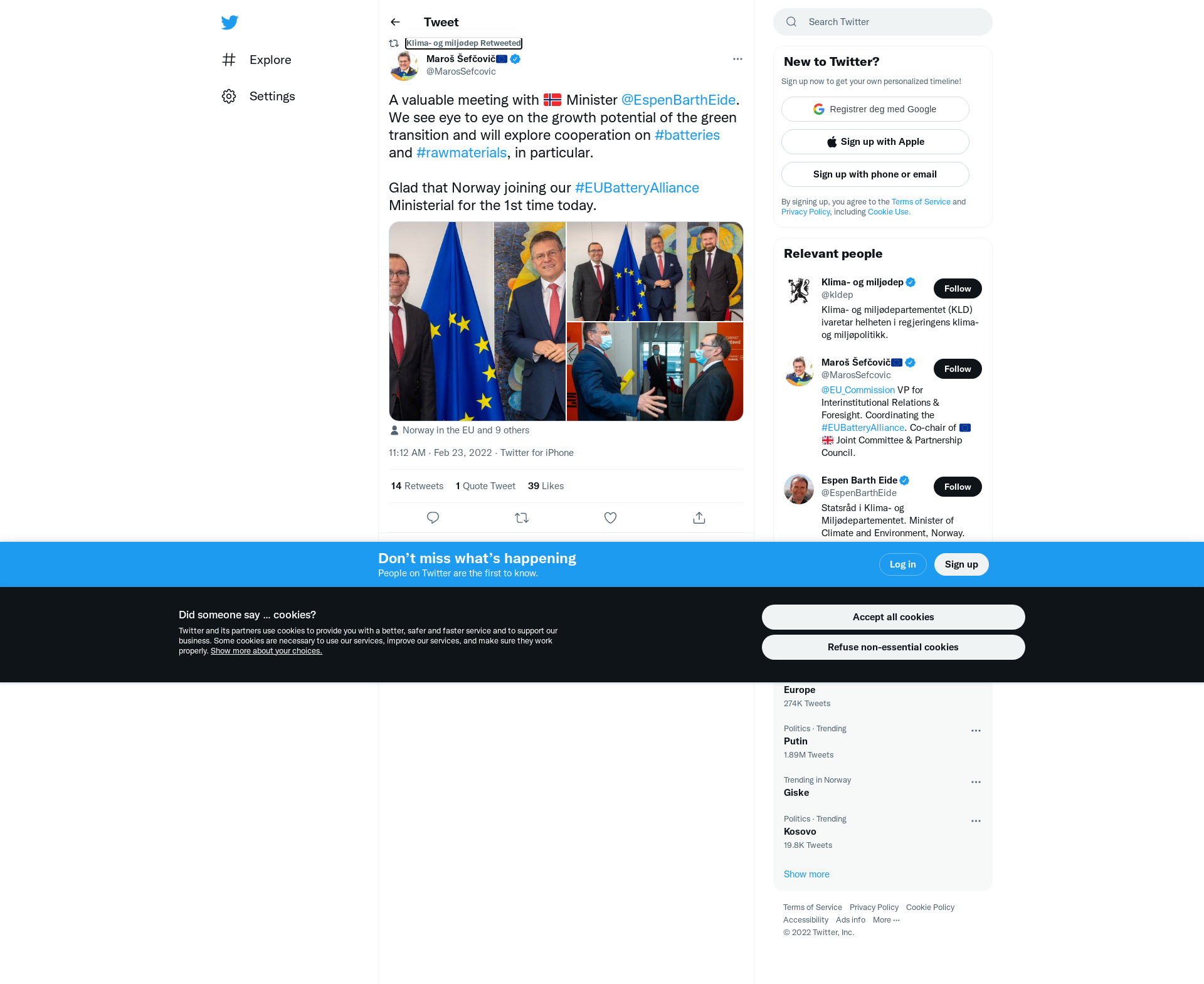 RT @MarosSefcovic: A valuable meeting with 🇳🇴 Minister @EspenBarthEide. We see eye to eye on the growth potential of the green transition and will explore cooperation on #batteries and #rawmaterials, in particular.\n\nGlad that Norway joining our #EUBatteryAlliance Ministerial for the 1st time today. https://t.co/RyXTOP4nHn
