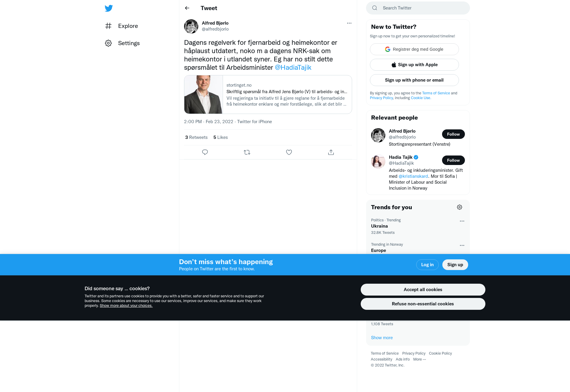 Vil regjeringa ta initiativ til å gjere reglane for å fjernarbeide frå heimekontor enklare og meir forståelege, slik at det blir lettare for folk å nytte dei høva ny teknologi og nye arbeidsformer gir til å ha ein friare og meir fleksibel kvardag?