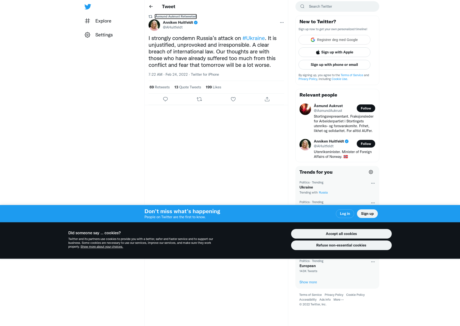 RT @AHuitfeldt: I strongly condemn Russia’s attack on #Ukraine. It is unjustified, unprovoked and irresponsible. A clear breach of international law. Our thoughts are with those who have already suffered too much from this conflict and fear that tomorrow will be a lot worse.