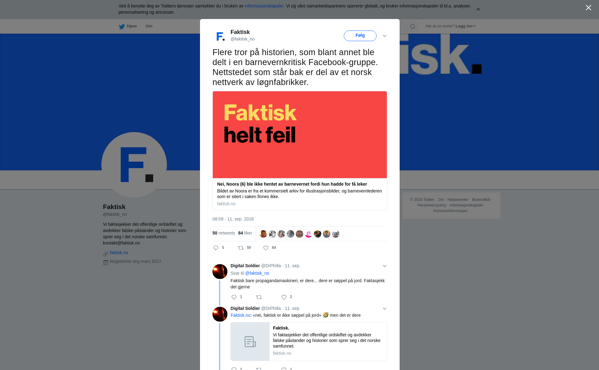 RT @faktisk_no: Flere tror på historien, som blant annet ble delt i en barnevernkritisk Facebook-gruppe. Nettstedet som står bak er del av et norsk nettverk av løgnfabrikker. https://t.co/8Ks3D5fydE