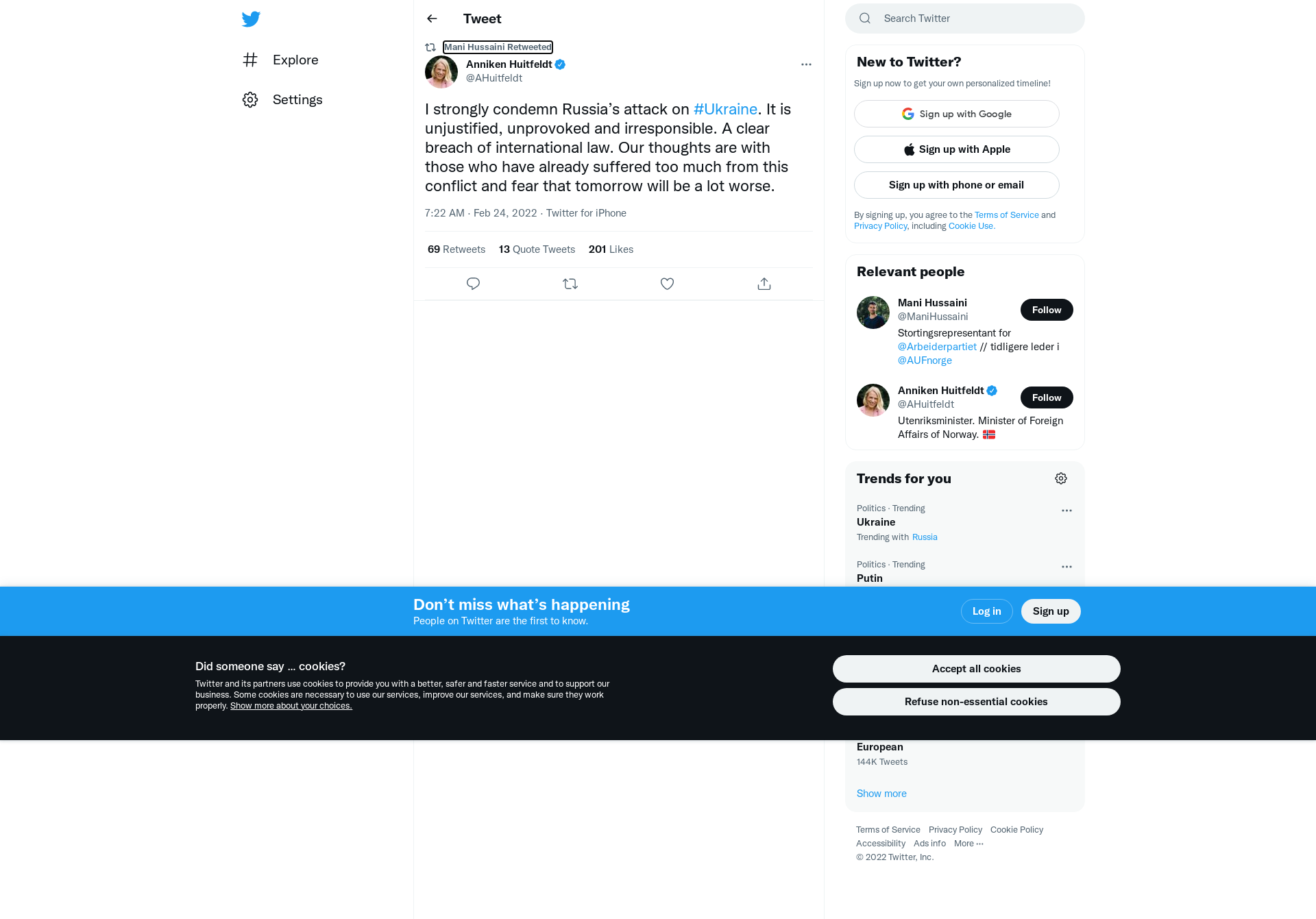 RT @AHuitfeldt: I strongly condemn Russia’s attack on #Ukraine. It is unjustified, unprovoked and irresponsible. A clear breach of international law. Our thoughts are with those who have already suffered too much from this conflict and fear that tomorrow will be a lot worse.