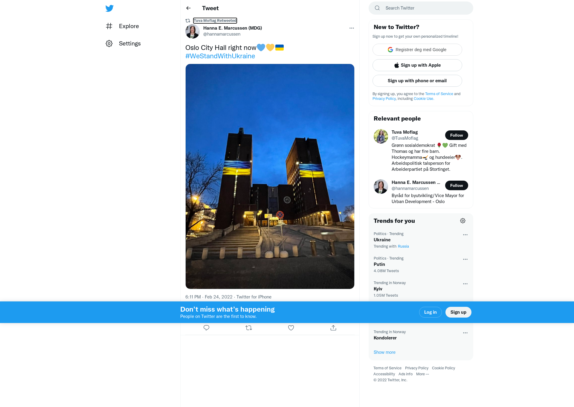 RT @hannamarcussen: Oslo City Hall right now💙💛🇺🇦 #WeStandWithUkraine https://t.co/AtX8nrXt2q
