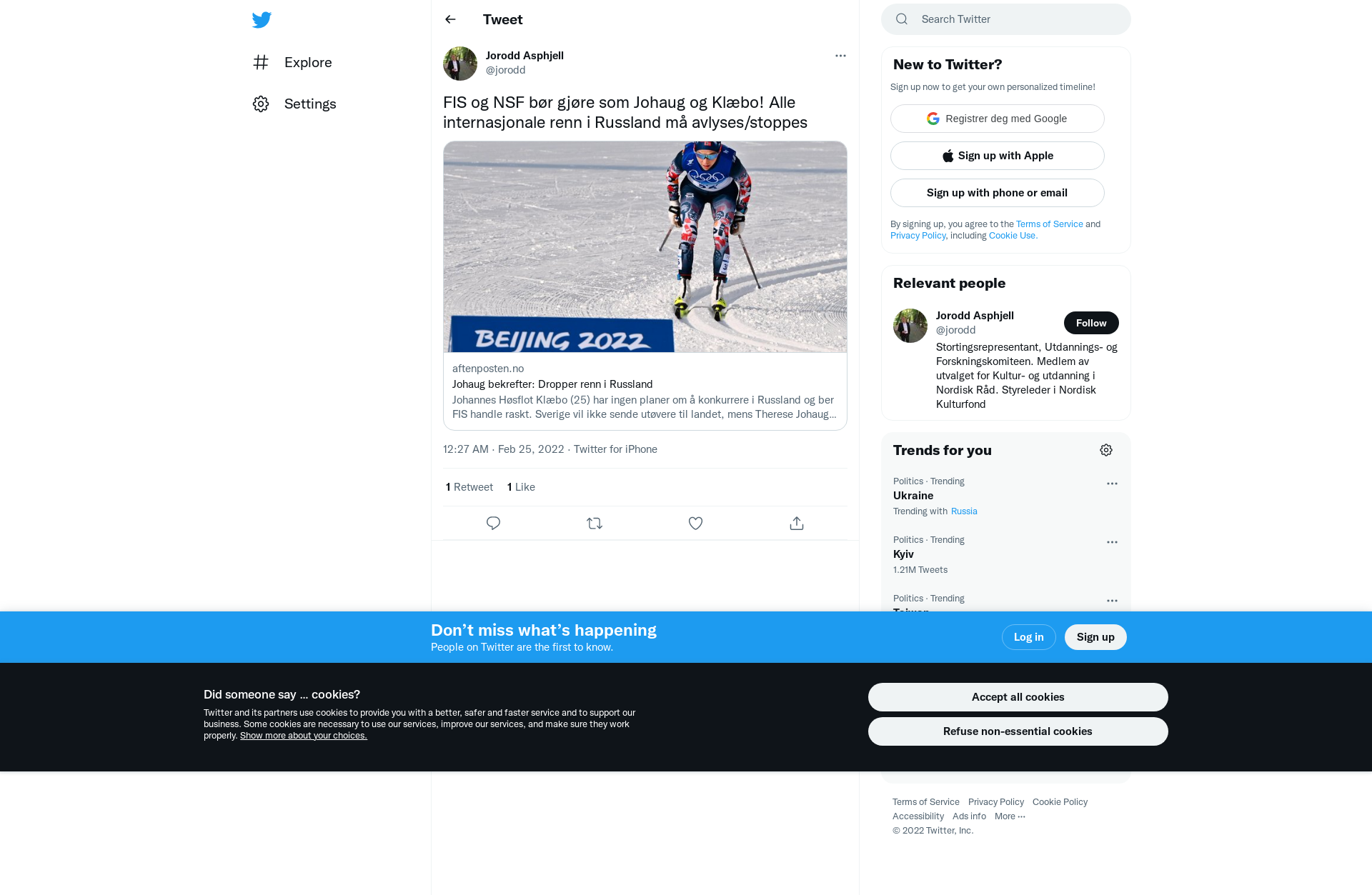 Johannes Høsflot Klæbo (25) har ingen planer om å konkurrere i Russland og ber FIS handle raskt. Sverige vil ikke sende utøvere til landet, mens Therese Johaug (33) bekrefter at hun ikke vil stille til start hvis ikke rennene flyttes vekk fra Russland.