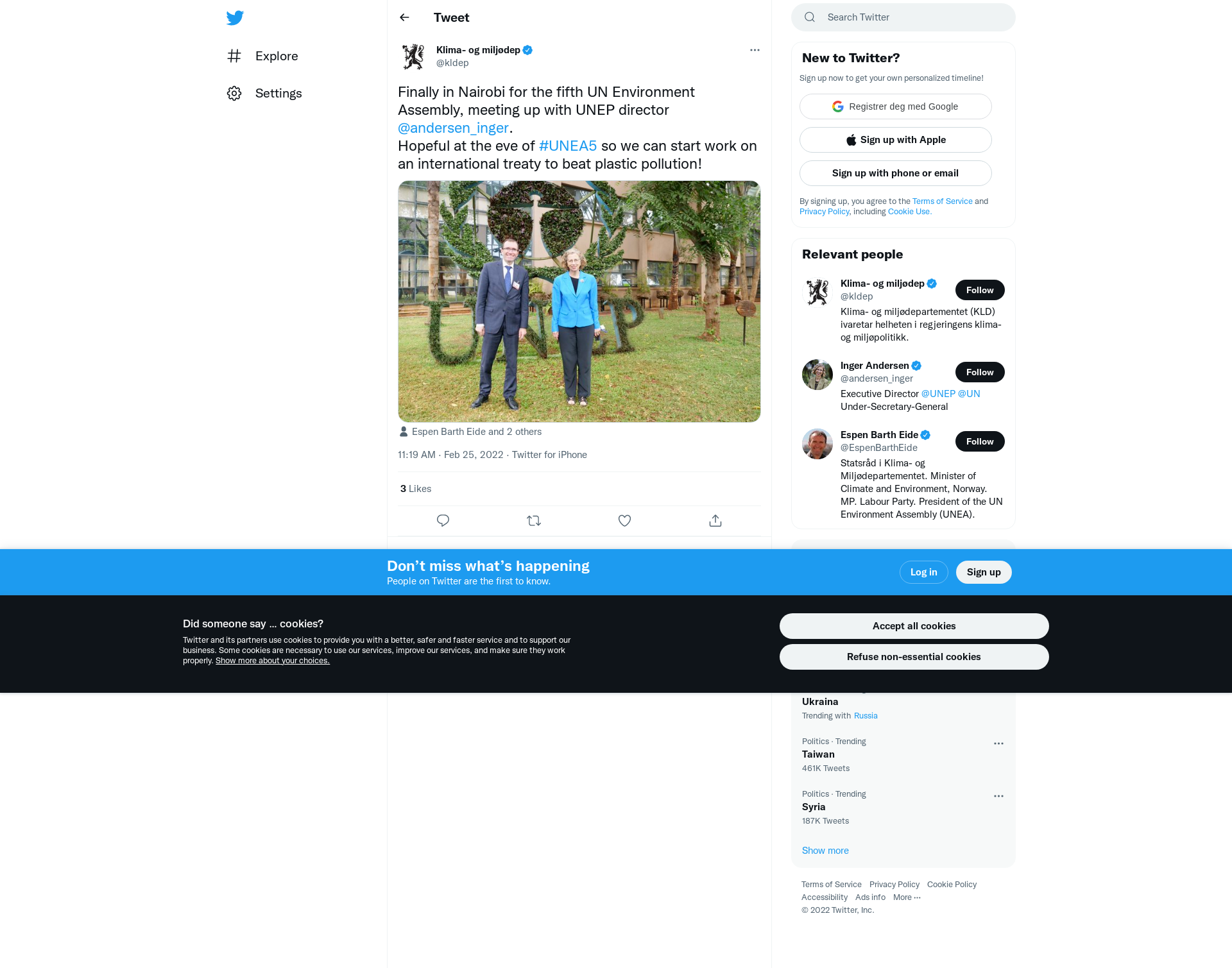 Finally in Nairobi for the fifth UN Environment Assembly, meeting up with UNEP director @andersen_inger.\nHopeful at the eve of #UNEA5 so we can start work on an international treaty to beat plastic pollution! https://t.co/pUMzvar5Iw