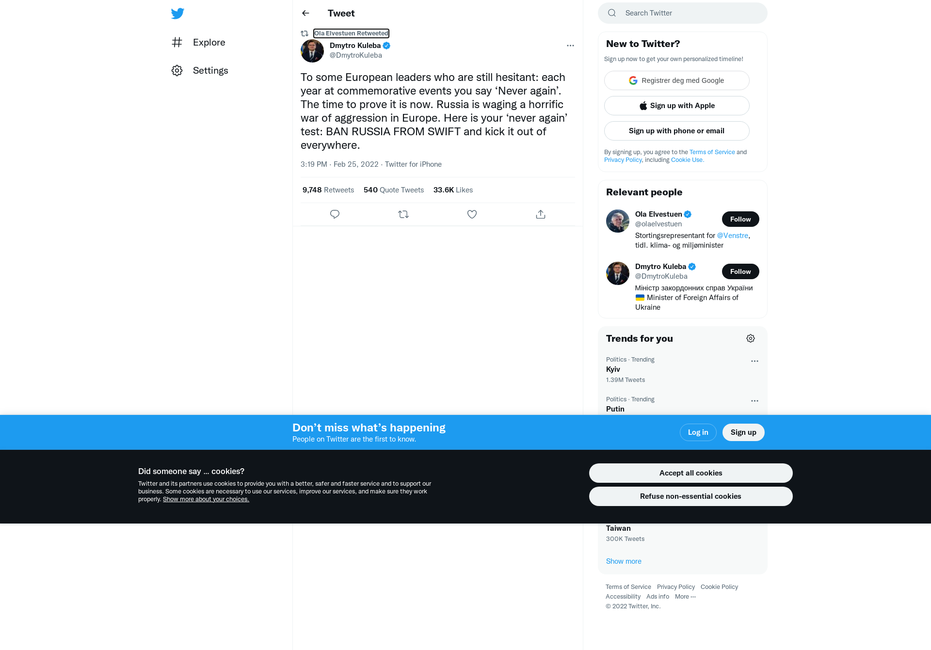 RT @DmytroKuleba: To some European leaders who are still hesitant: each year at commemorative events you say ‘Never again’. The time to prove it is now. Russia is waging a horrific war of aggression in Europe. Here is your ‘never again’ test: BAN RUSSIA FROM SWIFT and kick it out of everywhere.