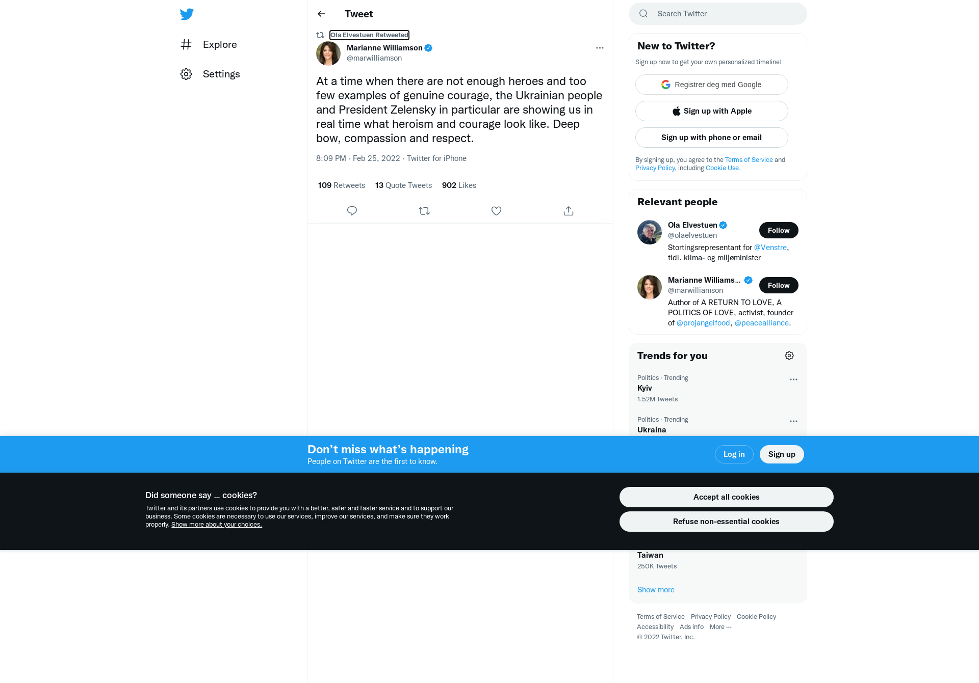 RT @marwilliamson: At a time when there are not enough heroes and too few examples of genuine courage, the Ukrainian people and President Zelensky in particular are showing us in real time what heroism and courage look like. Deep bow, compassion and respect.
