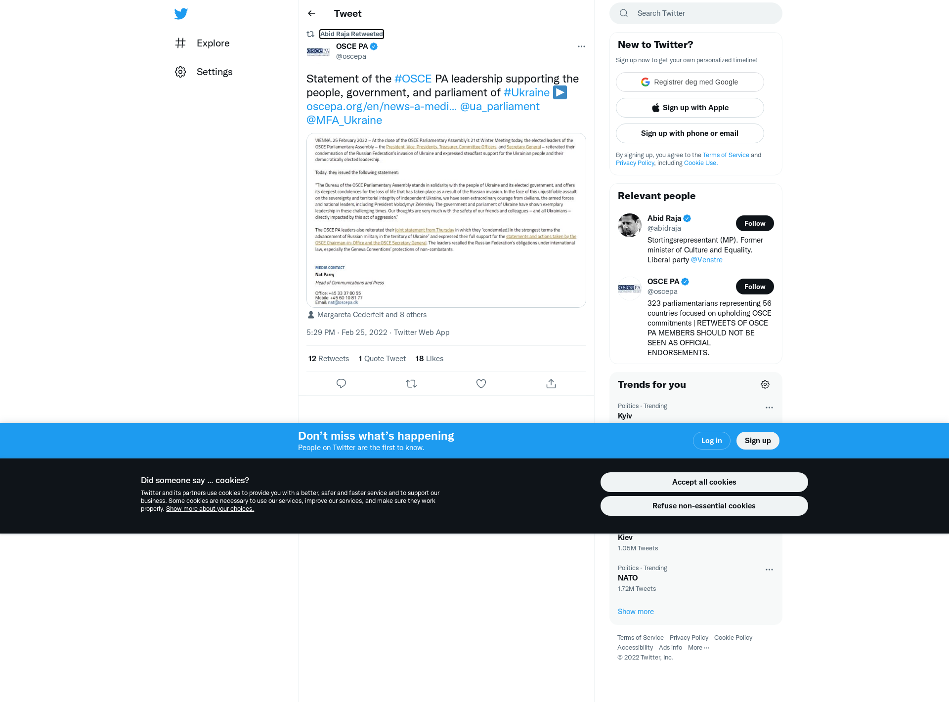 VIENNA, 25 February 2022 – At the close of the OSCE Parliamentary Assembly’s 21st Winter Meeting today, the elected leaders of the OSCE Parliamentary Assembly – the President, Vice-Presidents, Treasurer, Committee Officers, and Secretary General – reiterated their condemnation of the Russian Federation’s invasion of Ukraine and expressed steadfast support for the Ukrainian people and their democratically elected leadership. Today, they issued the following statement: “The Bureau of the OSCE Parliamentary