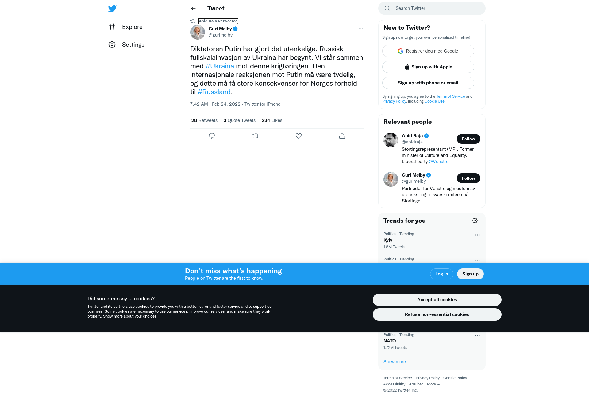 RT @gurimelby: Diktatoren Putin har gjort det utenkelige. Russisk fullskalainvasjon av Ukraina har begynt. Vi står sammen med #Ukraina mot denne krigføringen. Den internasjonale reaksjonen mot Putin må være tydelig, og dette må få store konsekvenser for Norges forhold til #Russland.