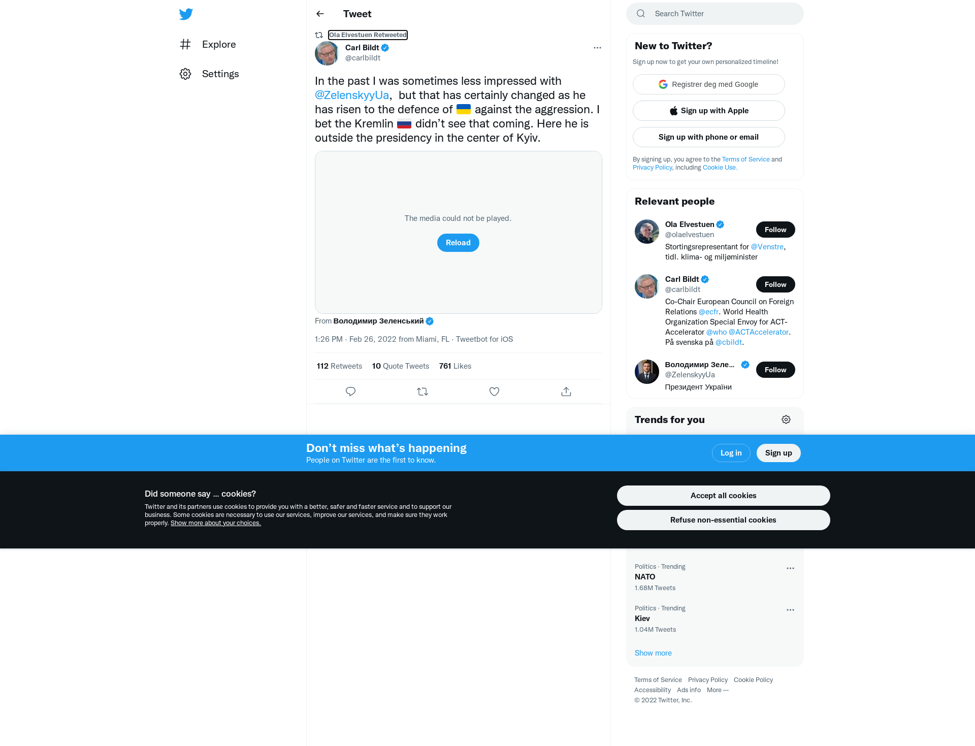 RT @carlbildt: In the past I was sometimes less impressed with @ZelenskyyUa,  but that has certainly changed as he has risen to the defence of 🇺🇦 against the aggression. I bet the Kremlin 🇷🇺 didn’t see that coming. Here he is outside the presidency in the center of Kyiv. https://t.co/buU3OwKi0U