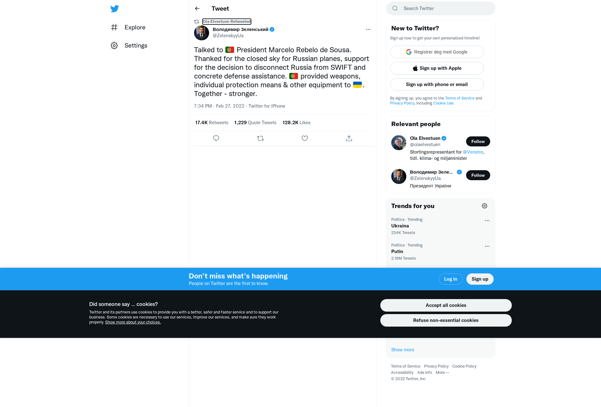 RT @ZelenskyyUa: Talked to 🇵🇹 President Marcelo Rebelo de Sousa. Thanked for the closed sky for Russian planes, support for the decision to disconnect Russia from SWIFT and concrete defense assistance. 🇵🇹 provided weapons, individual protection means & other equipment to 🇺🇦. Together - stronger.