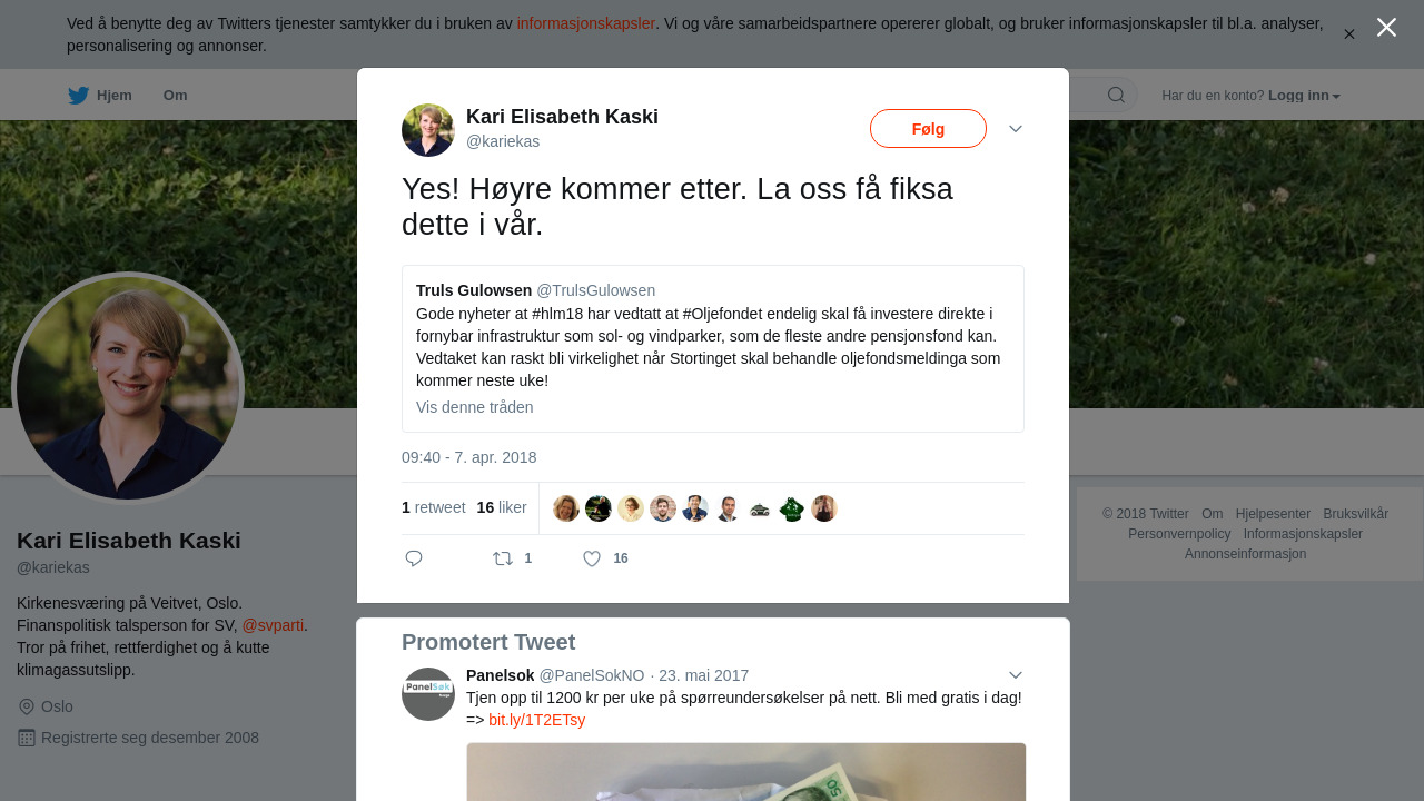 “Gode nyheter at #hlm18 har vedtatt at #Oljefondet endelig skal få investere direkte i fornybar infrastruktur som sol- og vindparker, som de fleste andre pensjonsfond kan. Vedtaket kan raskt bli virkelighet når Stortinget skal behandle oljefondsmeldinga som kommer neste uke!”