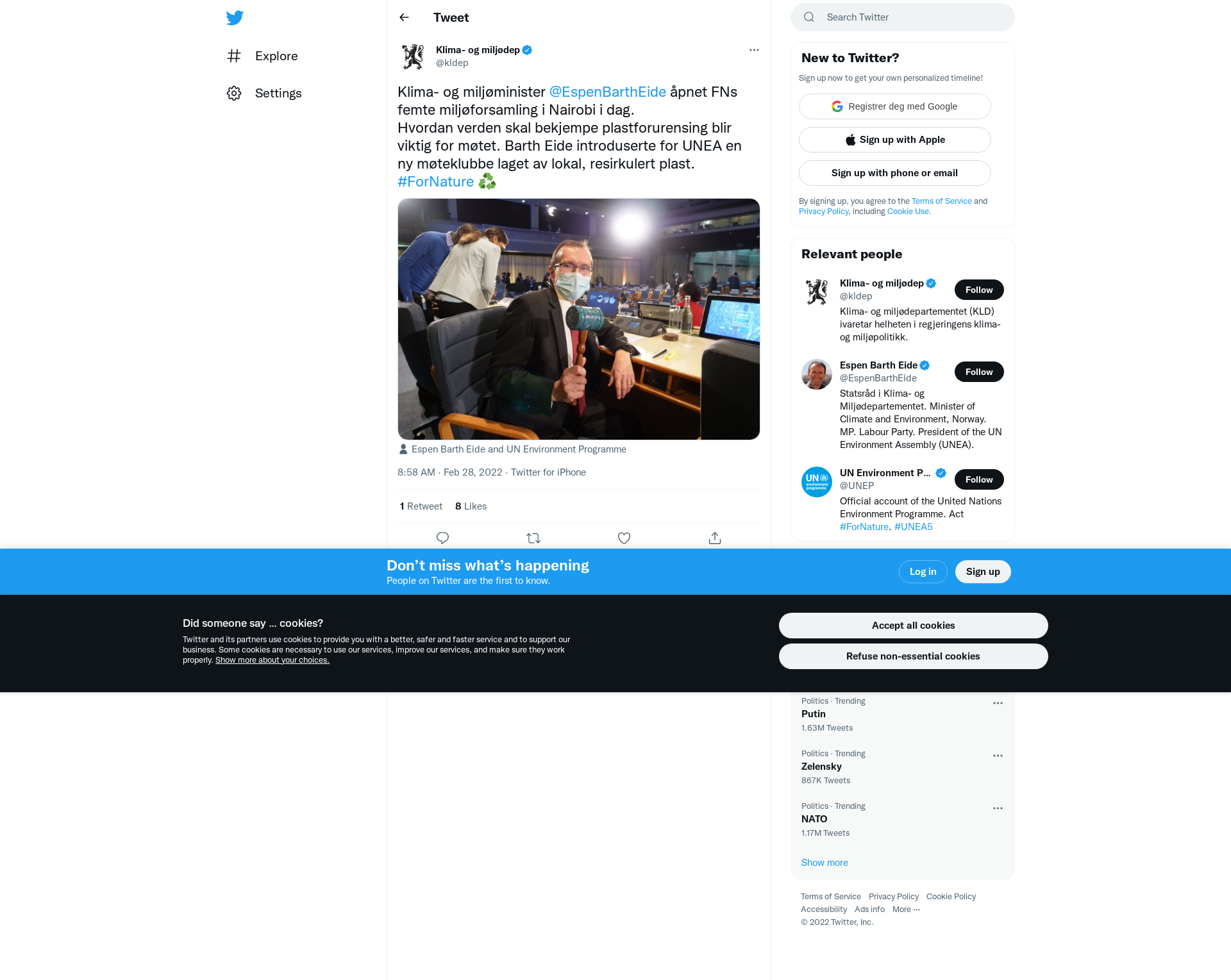 Klima- og miljøminister @EspenBarthEide åpnet FNs femte miljøforsamling i Nairobi i dag.\nHvordan verden skal bekjempe plastforurensing blir viktig for møtet. Barth Eide introduserte for UNEA en ny møteklubbe laget av lokal, resirkulert plast. #ForNature ♻️ https://t.co/mT8dq2inx3