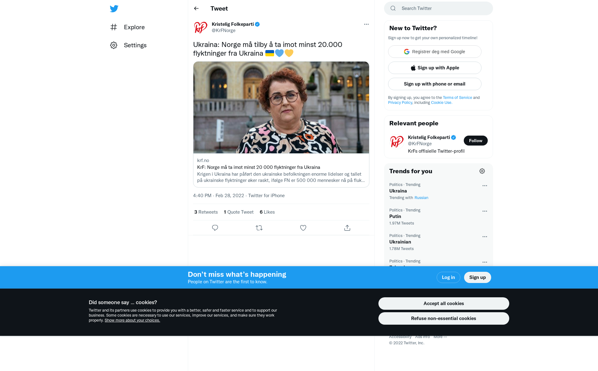 Krigen i Ukraina har påført den ukrainske befolkningen enorme lidelser og tallet på ukrainske flyktninger øker raskt, ifølge FN er 500 000 mennesker nå på flukt. KrF mener at Norge må stille opp for ukrainere, og tilby oss til å ta imot minst 20 000 ukrainske flyktninger.