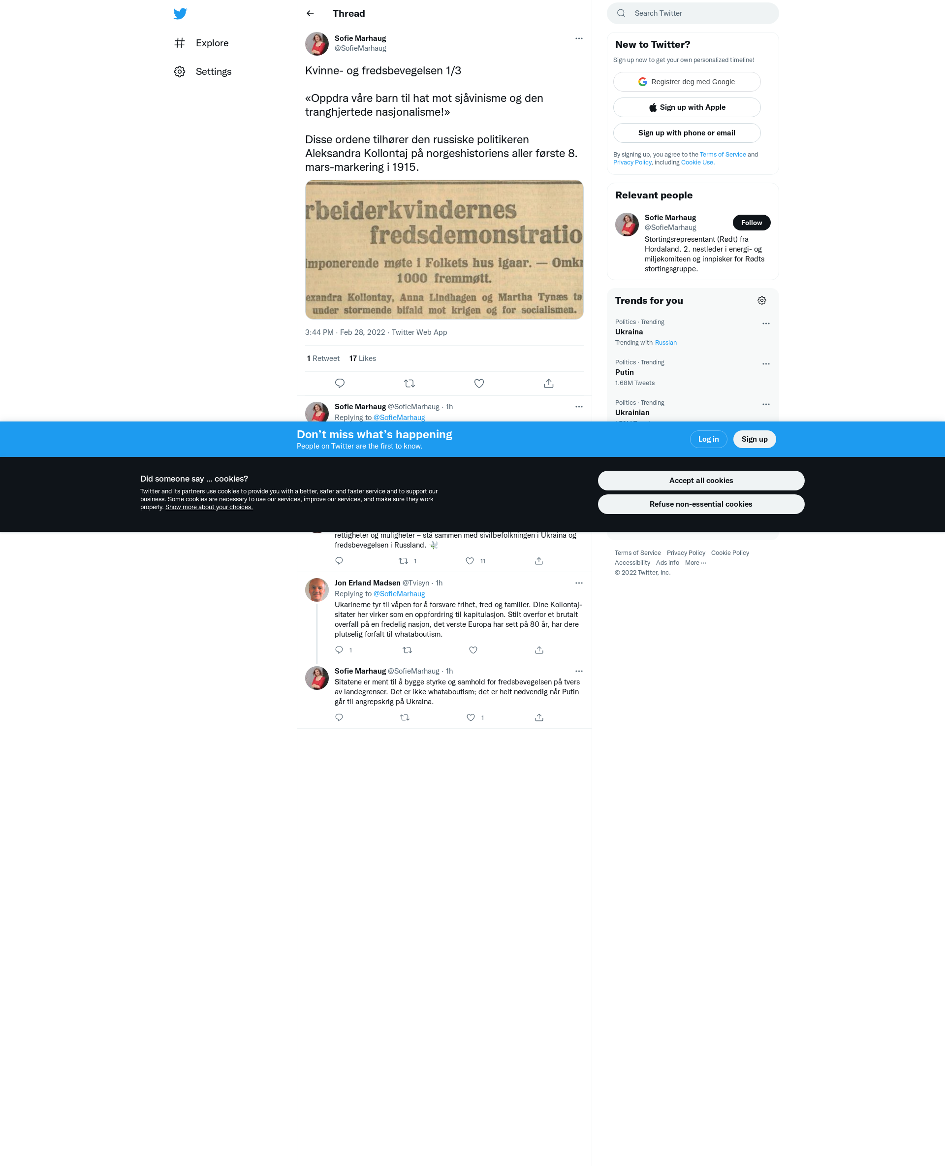 Kvinne- og fredsbevegelsen 1/3\n\n«Oppdra våre barn til hat mot sjåvinisme og den tranghjertede nasjonalisme!»\n\nDisse ordene tilhører den russiske politikeren Aleksandra Kollontaj på norgeshistoriens aller første 8. mars-markering i 1915. https://t.co/aJHpciqprL